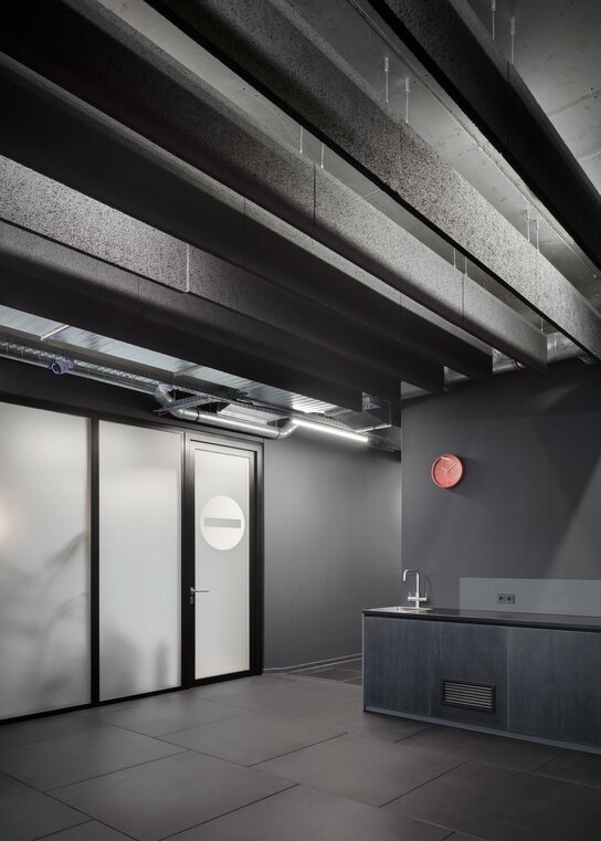 Bereits im Vorfeld der Baumaßnahmen führte die Lindner Group umfangreiche Akustiksimulationen durch, um trotz der geplanten offenen Bürowelten eine angenehme Raumakustik ohne störende Nebengeräusche zu gewährleisten. Denn die drei Geschosse zeichnen sich durch eine ausgewogene Mischung von Arbeits- und Rückzugszonen aus, die in einer Art Garagenstruktur angeordnet sind. Für die nötige Separation sorgen Trockenbauwände sowie Lindner Life Glastrennwände – zum Teil mit Folien versehen. Aluminium-Rohrrahmentüren und Holztüren bilden unter anderem die Zugänge zu den Besprechungsräumen. Um den sonst eher schlicht gehaltenen Räumlichkeiten einen Blickfang zu verleihen, wurden zudem spezielle Lindner-Deckenelemente im Gebäude verbaut: Die Lamellendecken mit bunten Akustikbaffeln sind nicht nur ein optisches Highlight, sondern verbessern auch maßgeblich die Raumakustik.