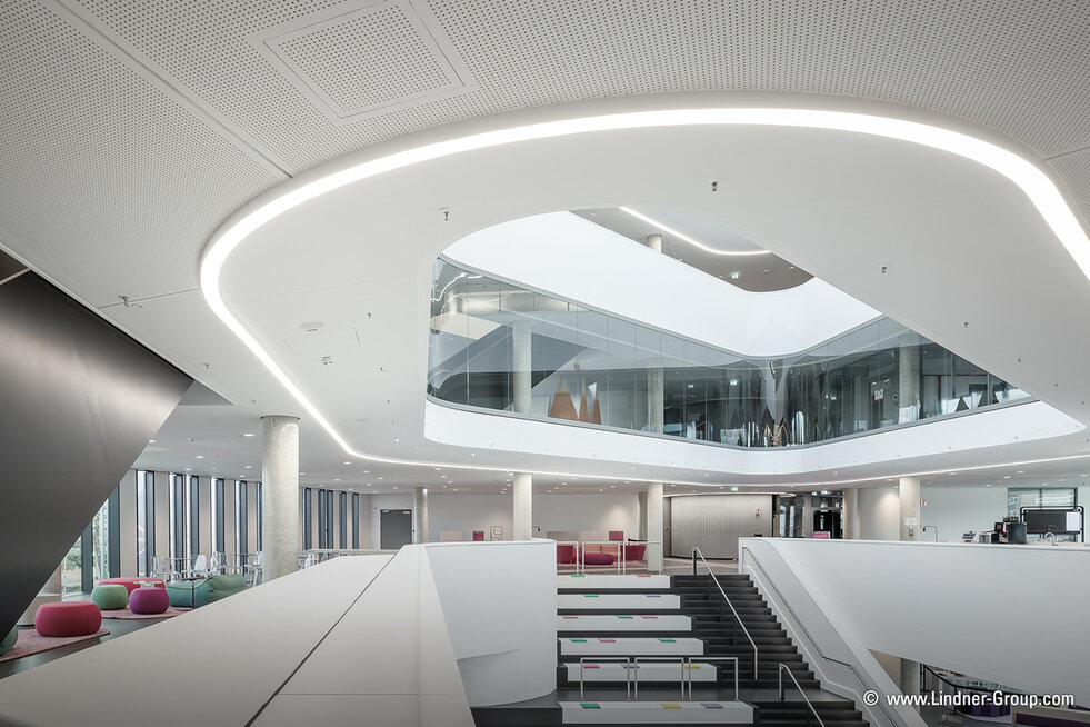 Heute zeigt sich die Umsetzung dieses Gedankens vor allem in den offenen Büroflächen und Meeting-Bereichen: Hier schaffen raumhohe Lindner Life Freeze 137 Glastrennwandsysteme sogenannte „Meeting Boxes“, welche als Rückzugsorte dienen. Zum Teil als geschwungene Glaswandelemente ausgeführt, unterstreichen sie den individuellen Designanspruch und werden dennoch den hohen statischen Anforderungen gerecht. Ergänzt wird das helle Gestaltungskonzept durch informelle Treffpunkte, Lounges sowie einem großen Atrium, welches als frei zugängliche Begegnungsfläche fungiert. Rücksprünge in der Fassade lassen im Außenbereich zudem zwei jeweils 100 m² Terrassen zum Entspannen im Freien entstehen. Bei der räumlichen Gestaltung wurden darüber hinaus einige Covestro Produkte wie beispielsweise Polycarbonat-Platten für die Innenfassaden sowie die Beschichtung des Terrazzo-Bodens verwendet.