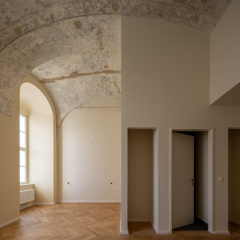 Die zentrale Herausforderung des Projekts lag in der Verbindung von Denkmalschutz und zeitgemäßem Ausbaustandard. Charakteristische Elemente des Originalgebäudes – darunter die Holzbalken im Dachgeschoss, die ursprünglichen Steindecken und Backsteinwände – blieben vollständig erhalten. Ergänzt durch hohe Fenster, die das Gebäude großzügig mit Tageslicht fluten, entstand eine besondere, geschichtsträchtige Atmosphäre.