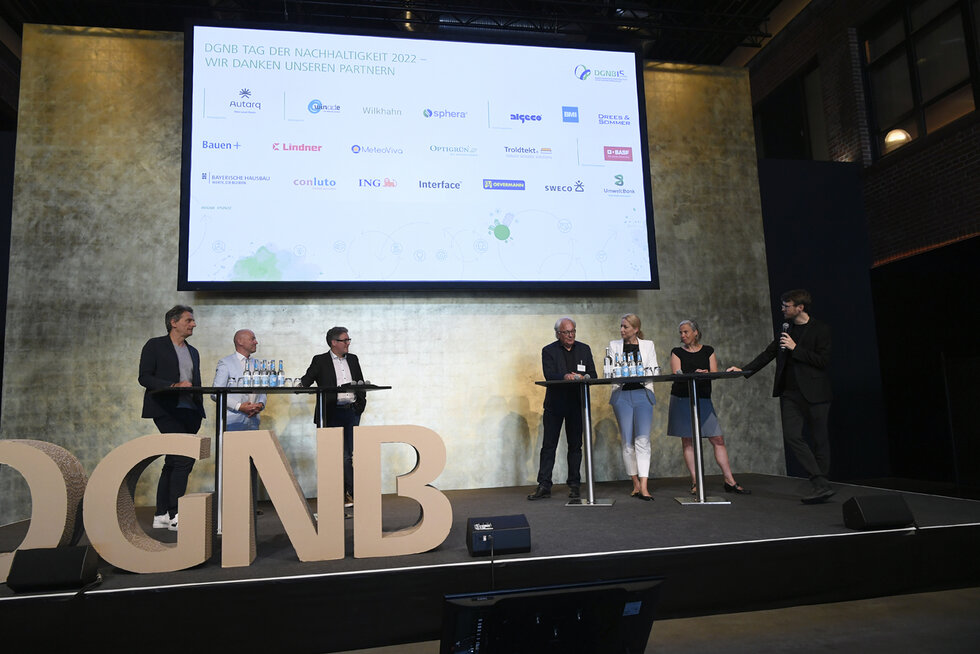 A special highlight of the event was the award ceremony for the winners of this year's DGNB Sustainability Challenge. New innovations and technologies are necessary to drive sustainability in the construction industry: With the Sustainability Challenge, the DGNB wants to give the most sustainable ideas a platform for further development. This year's jury prize in the "Research" category went to a team from the Chair of Sustainable Construction at the Karlsruhe Institute of Technology: With their "NEWood" project, they have created a resource-efficient alternative to classic MDF and chipboards. Among the start-ups, mygreentop came out on top with a green roof system for pitched roofs. The winner of the "Innovation" category was the company Home Power Solutions with a hydrogen-based electricity storage system. The audience award went to the German Aerospace Centre with their research project "Lime Storage".