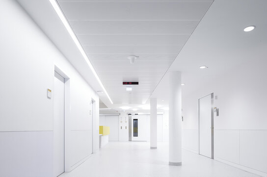 The ceiling system is easy to clean due to its smooth surface and can be perforated for acoustic requirements. In addition, the F30 Senk-Schiebe metal ceiling offers very good possibilities for tolerance compensation on the corridor partition wall due to adjustable wall connections. The free span construction meets all the requirements of an F30 fire protection ceiling and can withstand a fire for at least 30 minutes. The fire-rated ceiling also allows easy and quick access to the ceiling void, providing additional flexibility in the design of the TGA.
