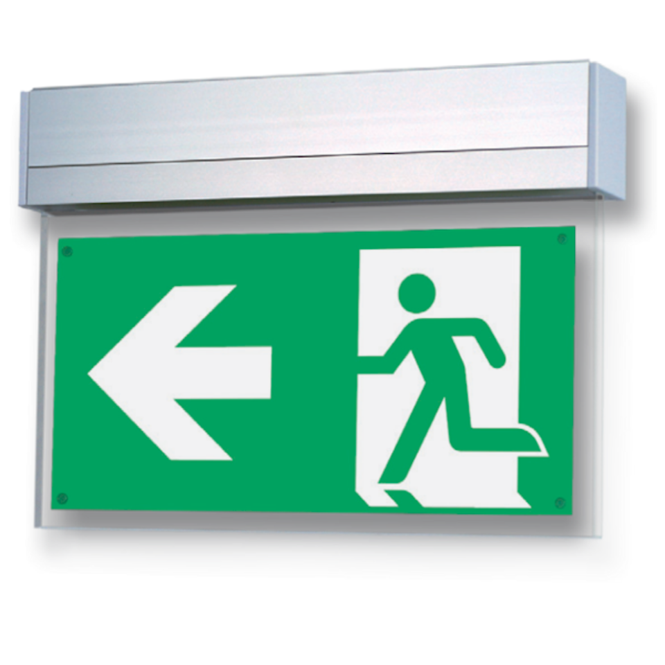 Suspended pictograms are essential in necessary corridors to mark the escape route. The escape sign luminaires of SRB can easily be fastened to our LMD fire rated metal ceilings and are available with arrow to right, to left or downwards.