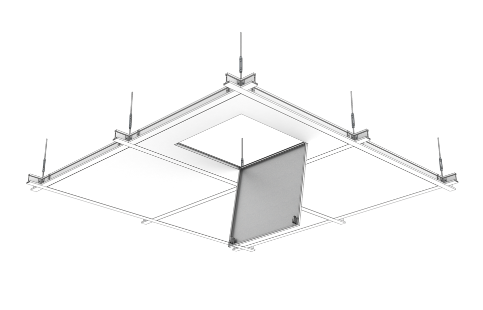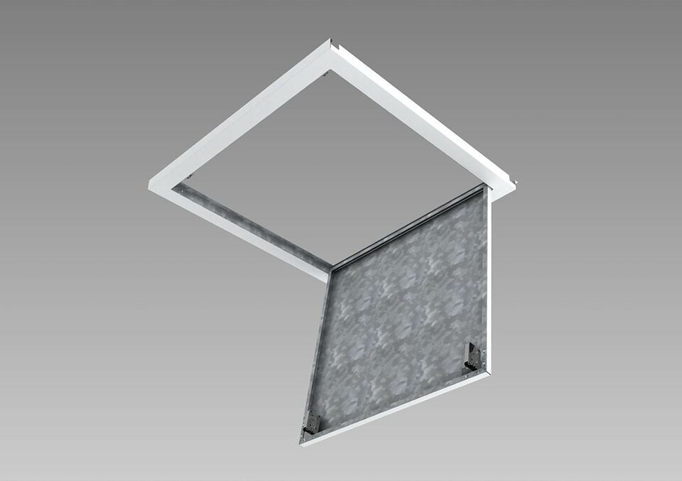 Inspection hatches in flush-mounted construction available for all Lindner ceiling systems, integrated in a metal cassette/ceiling plate, with spring catches and all-round additional seal, which meets the most diverse requirements for room design and technology.