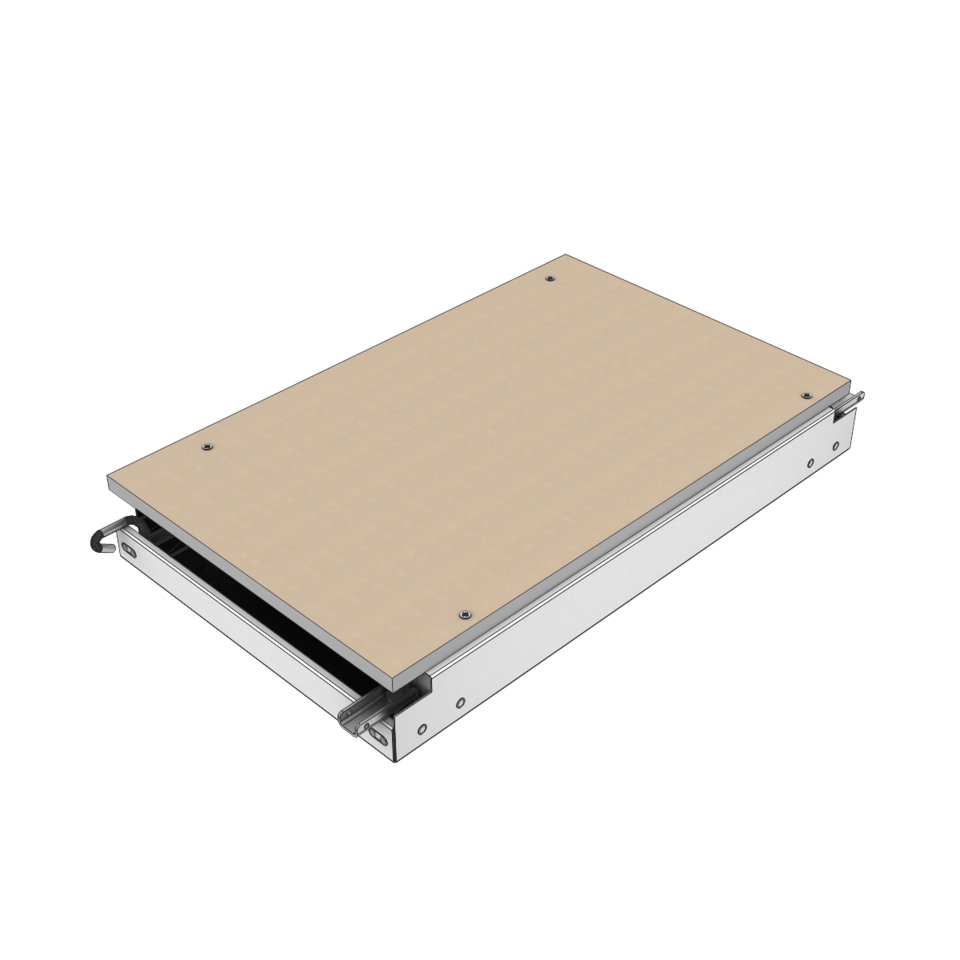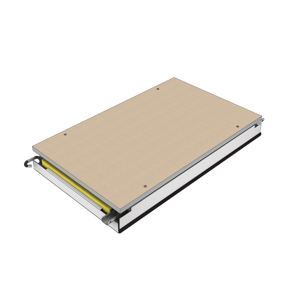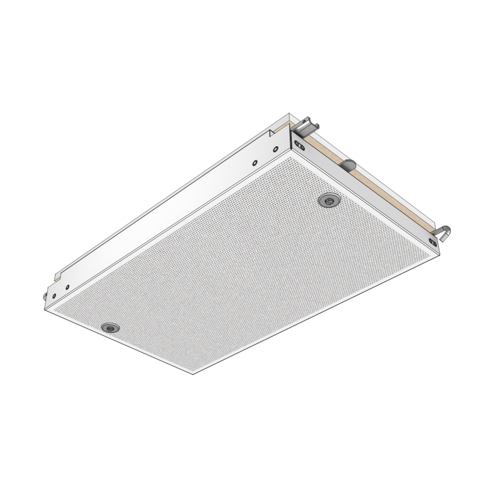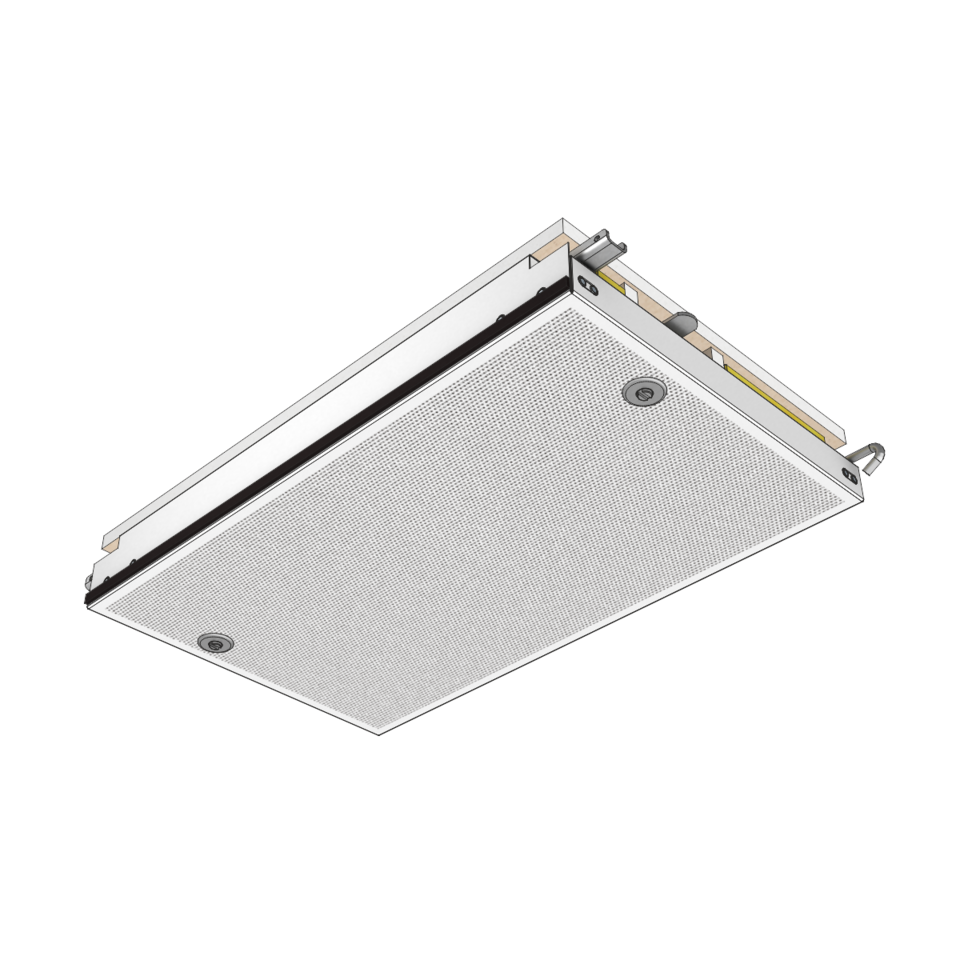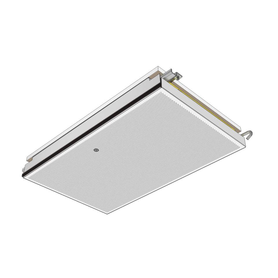 The ceiling elements – with or without mineral wool – are positioned in G-profiles. They can be individually swung down and slid by means of a dismantling tool – no additional ceiling void is necessary. Up to three ceiling elements can be moved together to receive a large inspection opening. Thanks to an adjustable wall connection, an excellent compensation of tolerances on the wall in possible. Stable hinging hooks offer maximum security against unintended lifting.