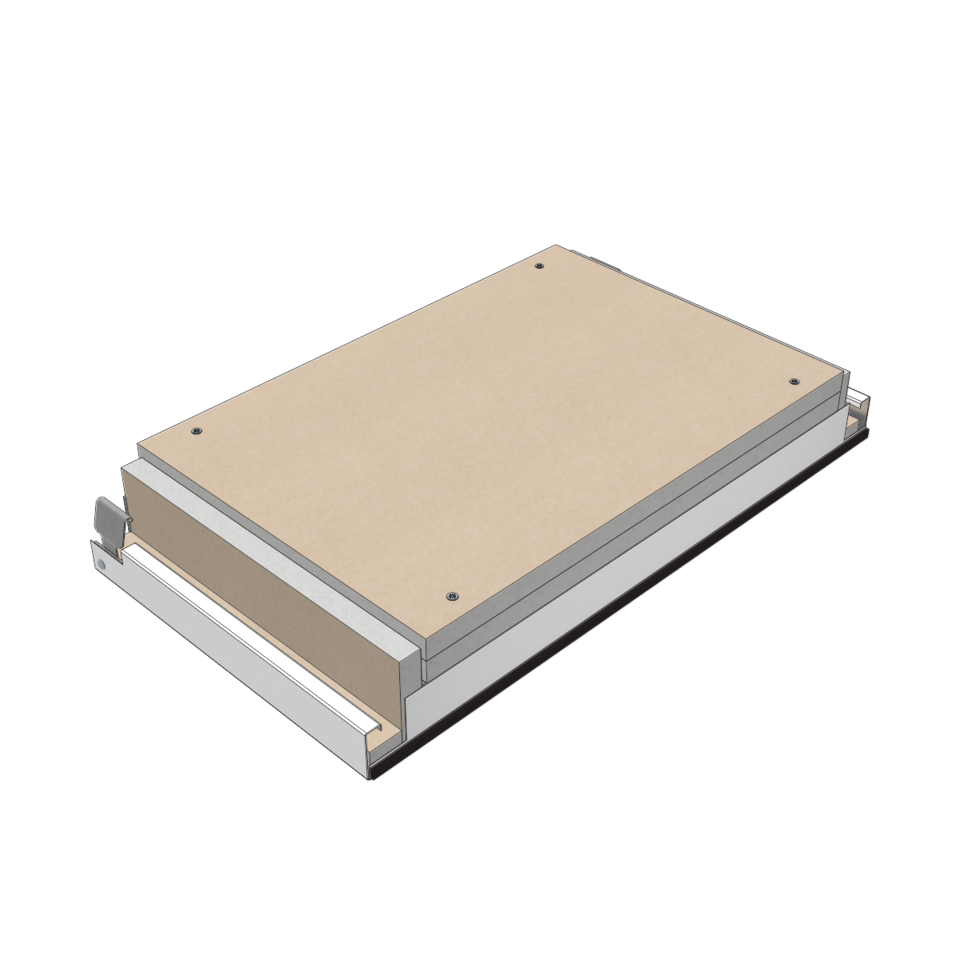 The ceiling elements of this fire rated ceiling are hooked onto carrier rails on both sides of the corridor. They can be swung down and slid along the corridor without the need for any tools. No additional ceiling void is required for maintenance works. This fire rated ceiling enables a good compensation of tolerances on the wall.