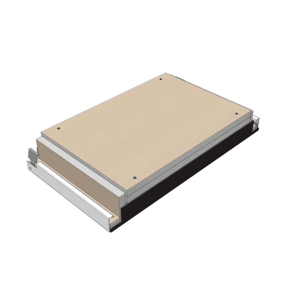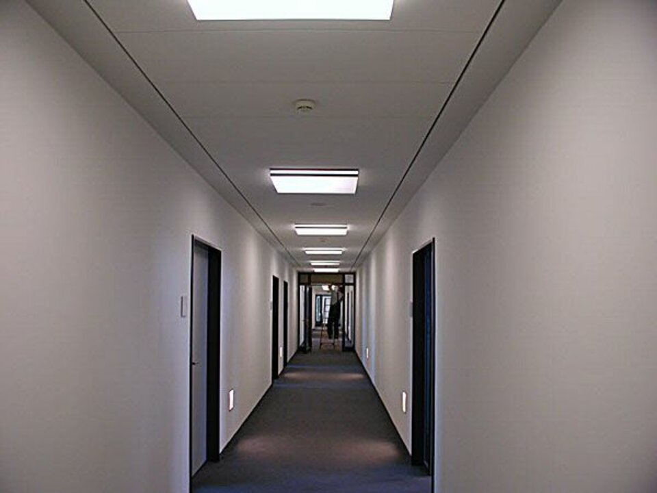 The ceiling elements of this fire rated ceiling are hooked onto carrier rails on both sides of the corridor. They can be swung down and slid along the corridor without the need for any tools. No additional ceiling void is required for maintenance works. This fire rated ceiling enables a good compensation of tolerances on the wall.