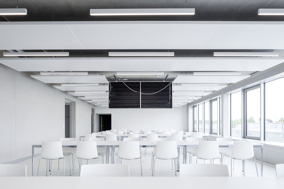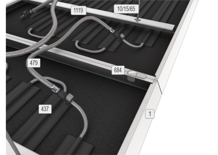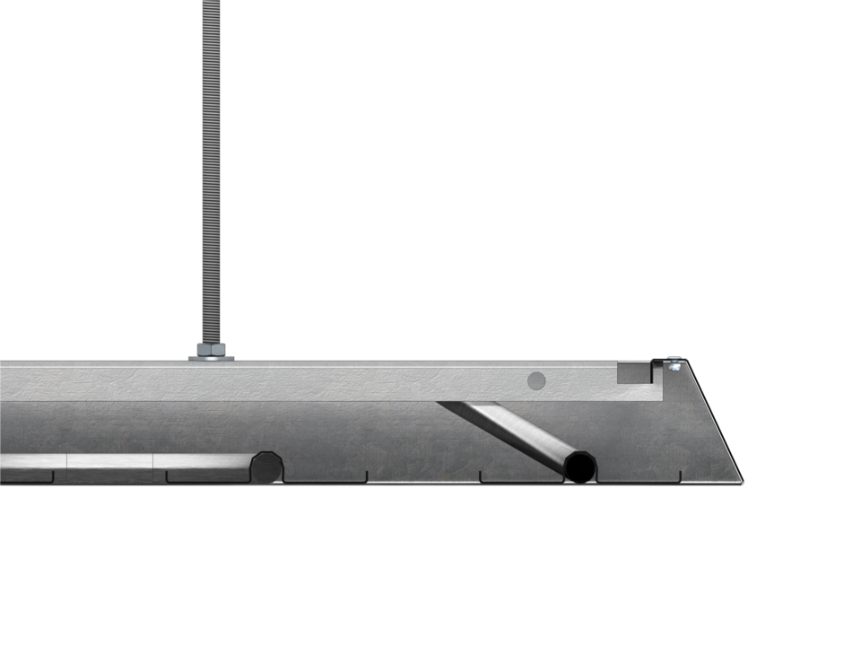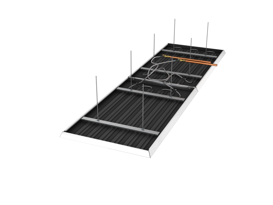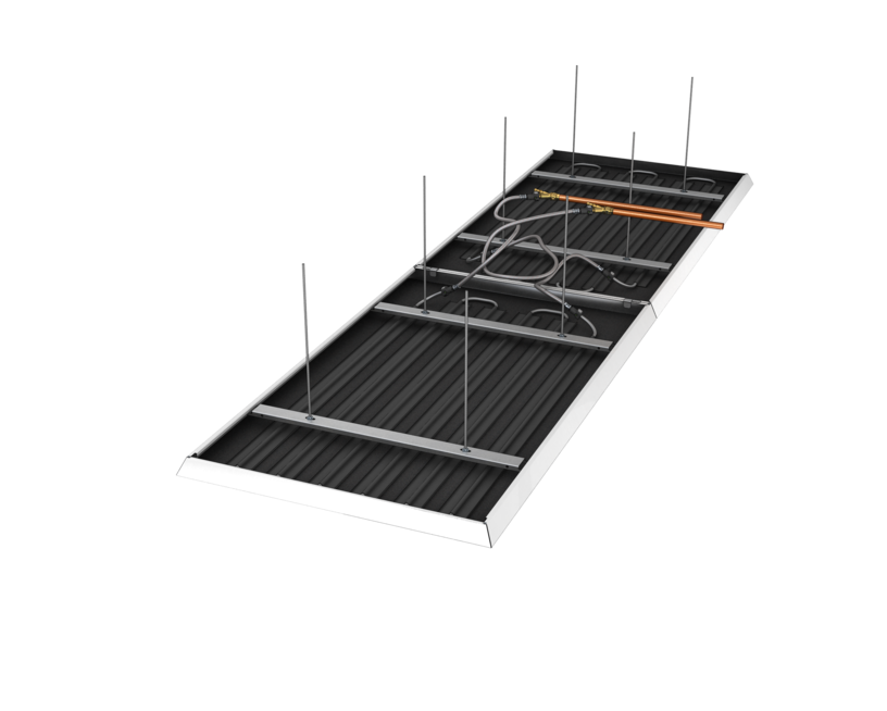 The metal canopy ceiling in open construction provides for pleasant climate and good acoustics in your rooms. The large-sized ceiling panels can be designed with vertical or angled edge. They can individually be arranged in your rooms. The free space between the canopies offers you the possibility to independently fasten installations. The ceiling panels can quickly be installed. No tools are required to remove the ceiling panels. It is possible to combine thermally active and passive areas of this cost-effective system.