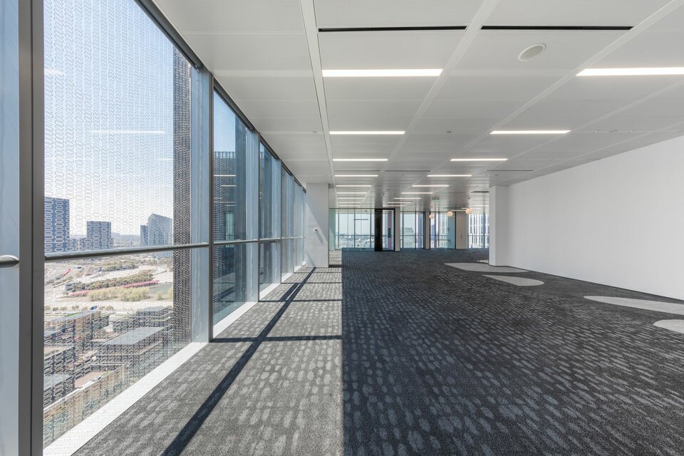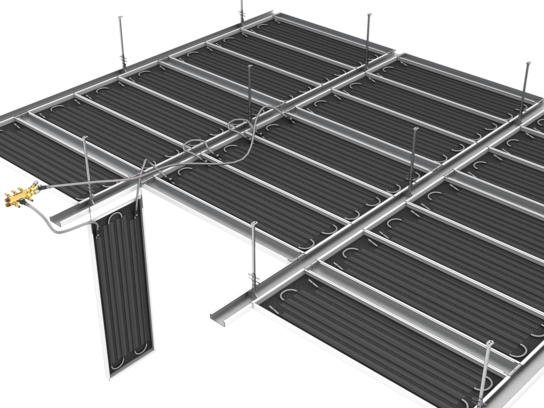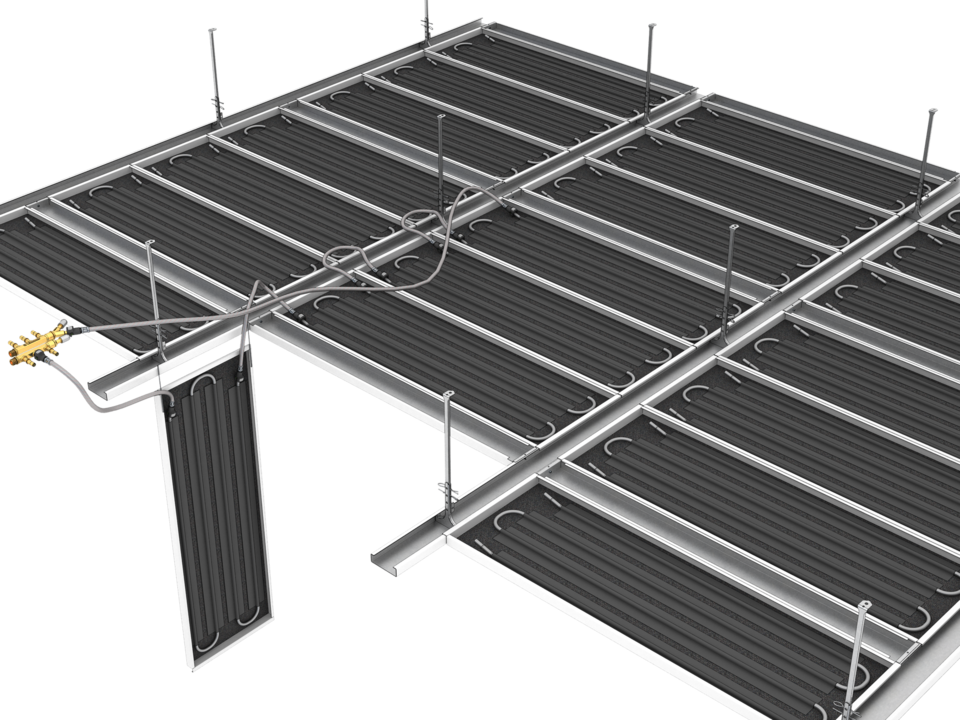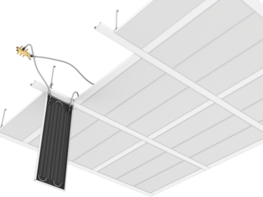 This post cap ceiling creates an ideal indoor climate thanks to radiant heating and cooling. Cross noggins define the visual appearance of this system and offer many advantages: partitions can be fastened to post caps in both directions. Moreover, possible future room sizes can be identified. Luminaires or technical installations can be integrated into the post caps. The post cap ceiling with cross noggins has a low construction height and is maintenance-friendly thanks to ceiling panels that can individually be operated. Thermally active and passive areas can be combined.