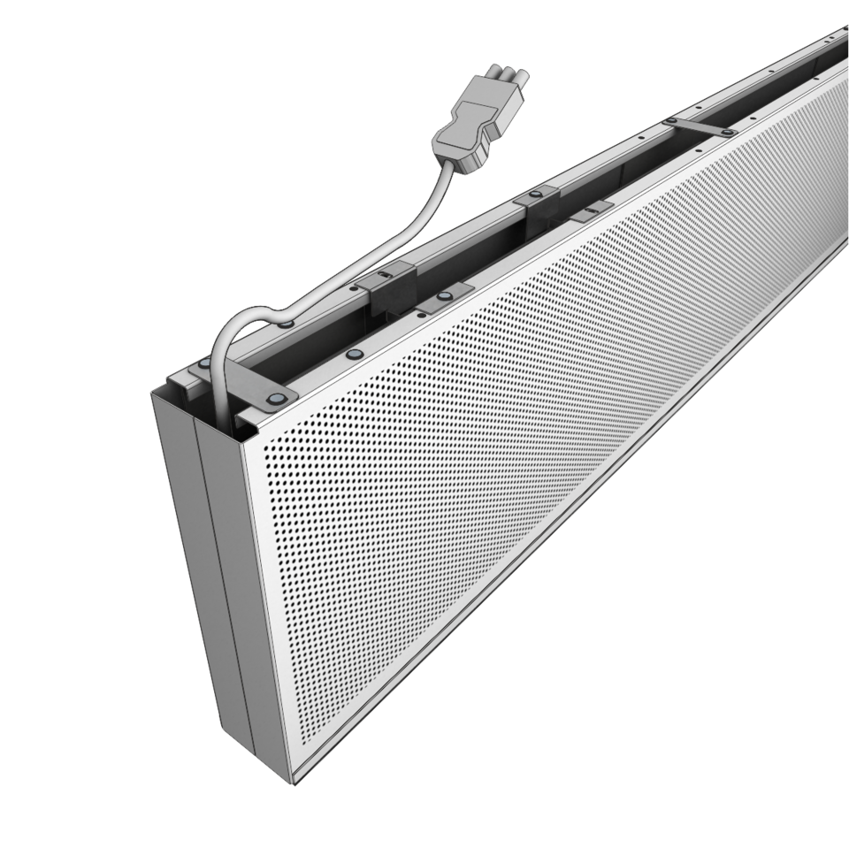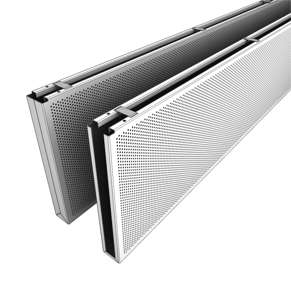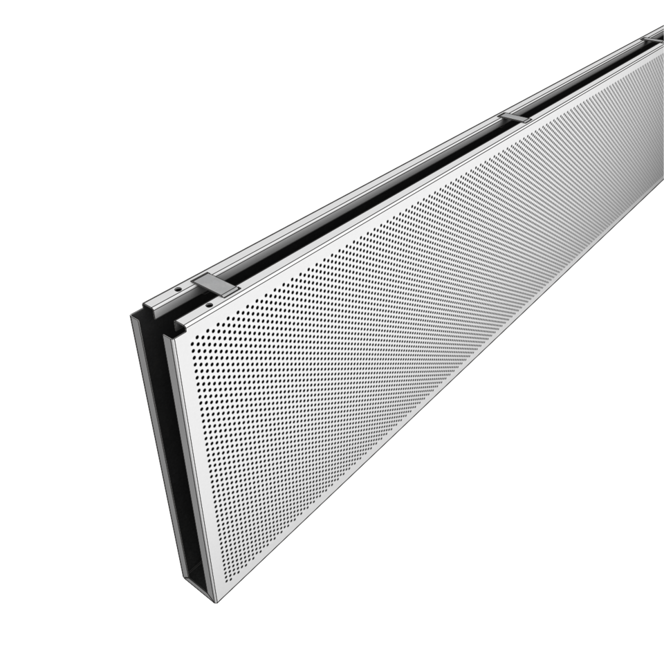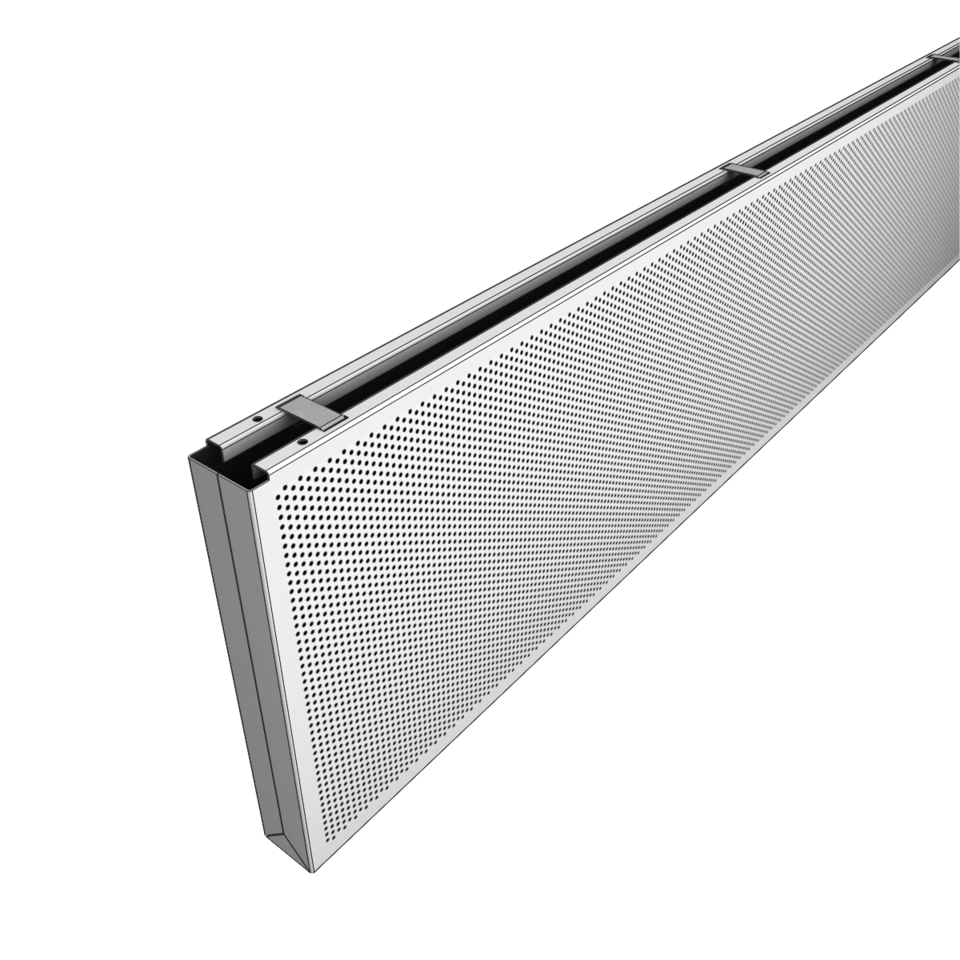 The linear design of the one-piece metal baffles offers versatile possibilities of installation thanks to different centre distances and baffle sizes. The individual baffle distance enables an easy integration of necessary fixtures in the visible ceiling void between the baffles. The construction made of suspension channels guarantees an easy and quick installation.