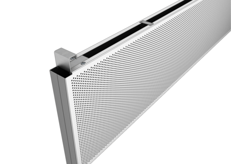 This high-grade baffle ceiling is especially suitable for areas with increased maintenance demands. Due to movable one-piece baffles, you can comfortably reach the ceiling void. The linear baffles can quickly and easily be installed in different sizes and centre distances. Free spaces between the baffles can be used for different installations such as luminaires, sprinklers or for the suspension of signs.