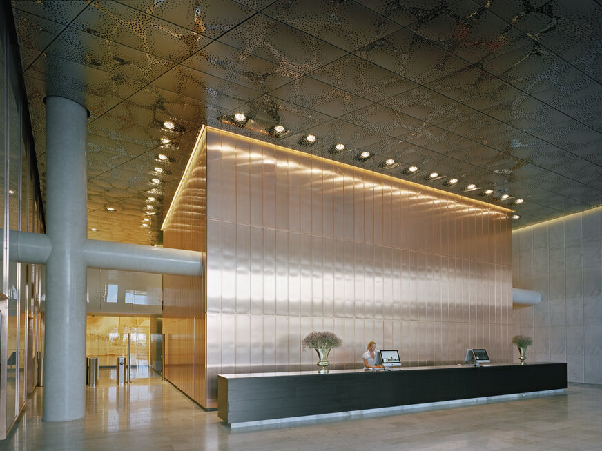 The system LMD-E 213 is characterised by accentuated joints in both directions along the ceiling panels, generating a special ceiling layout. Open Hook-On profiles create a homogeneous ceiling surface and an appealing look. Flexible shapes such as rectangular, trapezoidal or triangular ceiling panels enable individual, project-related design options. Ceiling panels that can be removed or swung down and slid without tools are available.