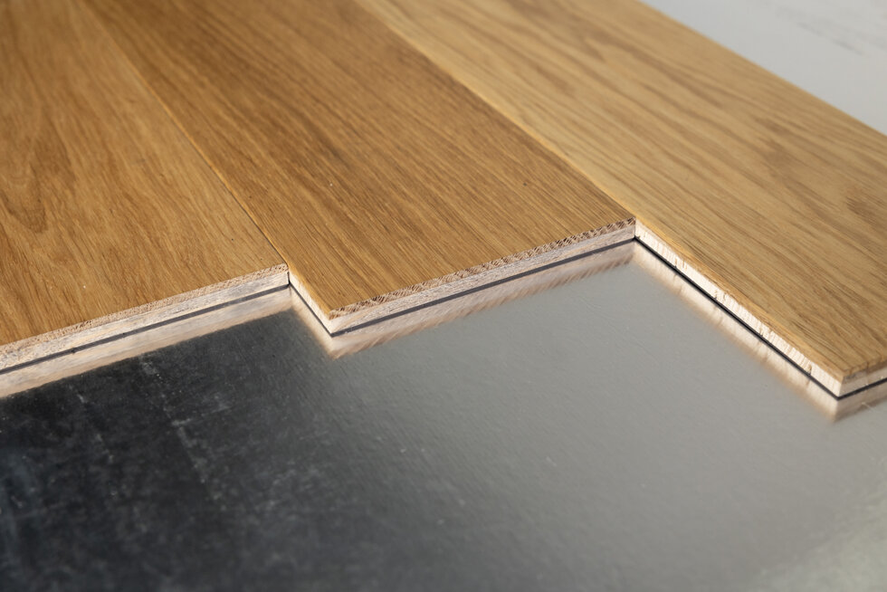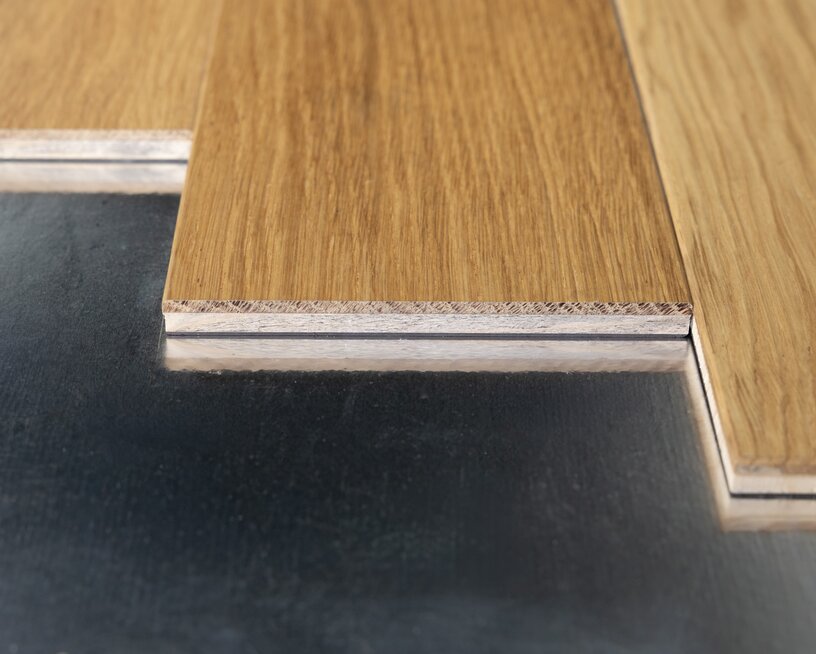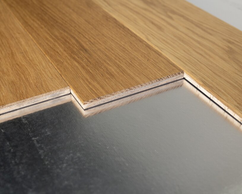 The Landhaus Diele flex is glued together as a 2-layer parquet and lives from the characteristics and wooden properties of the oak material. As a deck, a top layer identical to a classical multi-layer parquet with a wear layer of 4mm thickness is used. The appearance of the wood can be chosen either to be a simple knotless sorting or a rustic knotty sorting. The spruce middle-layer ensures a high stability of the construction.