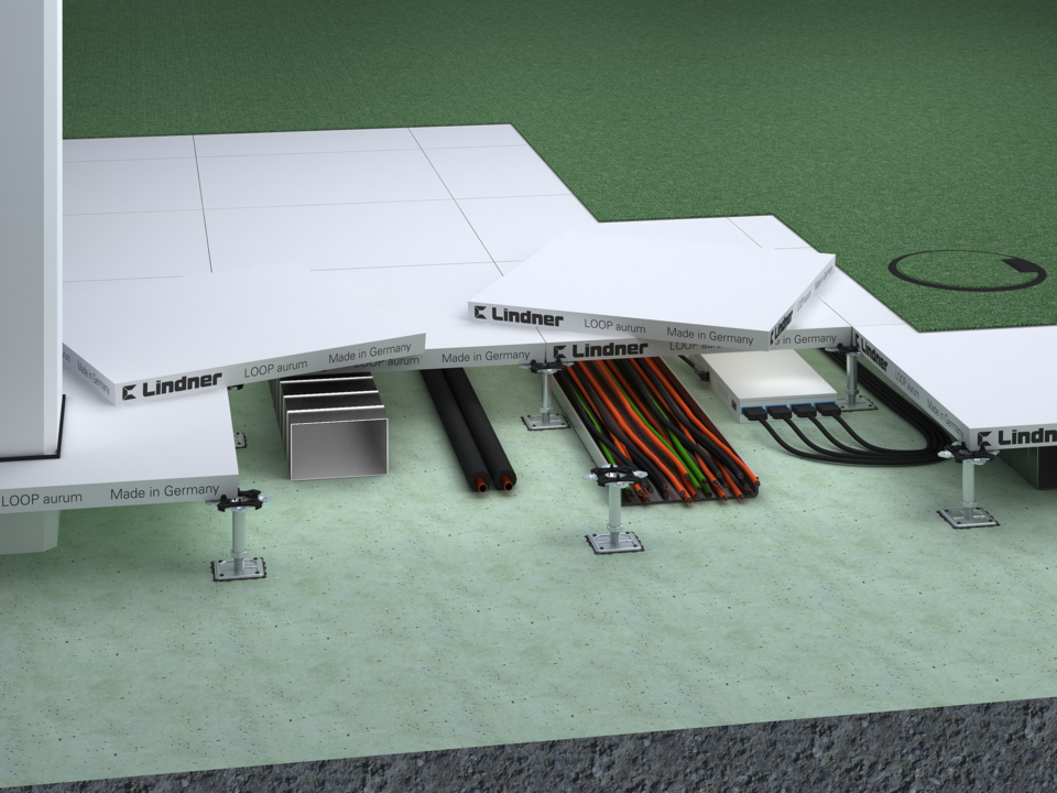 The raised floor panels, refurbished on five sides, are made of calcium sulphate. LOOP aurum does not require an edge trim or application on the bottom. Self-laying floor coverings are laid on site.