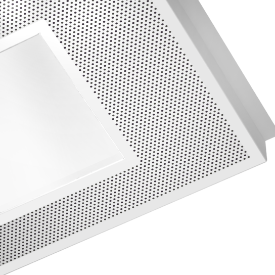 The lighting fixture IS 17 is framelessly and flush-mounted integrated into the metal ceiling element. It is delivered as a factory-prepared combined module without colour deviation.