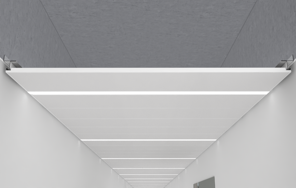 Our lighting fixture LK 73 can be adjusted to your ceiling solution. The luminaire is produced project-related with hang-in system, for integration between the Lindner metal ceiling. Light is distributed via a an opal acrylic diffusor, optional with a microprismatic cover.