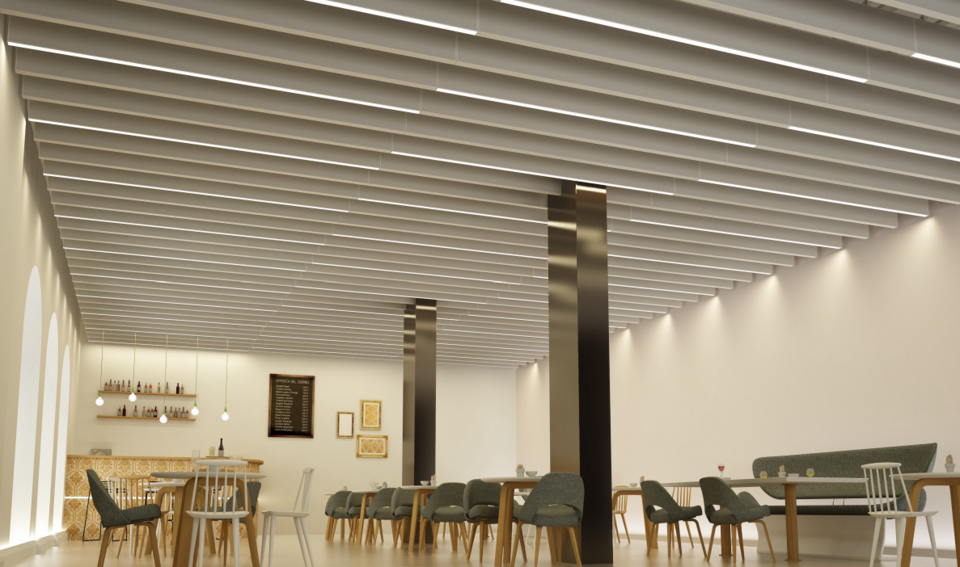Our system luminaire type LShine is the ideal lighting solution for Lindner baffle ceiling systems. It is delivered as an integrated entire modul consisting of luminaire and baffle ceiling. Besides the linear version, the luminaire can be produced for curved Lindner baffle ceiling systems.