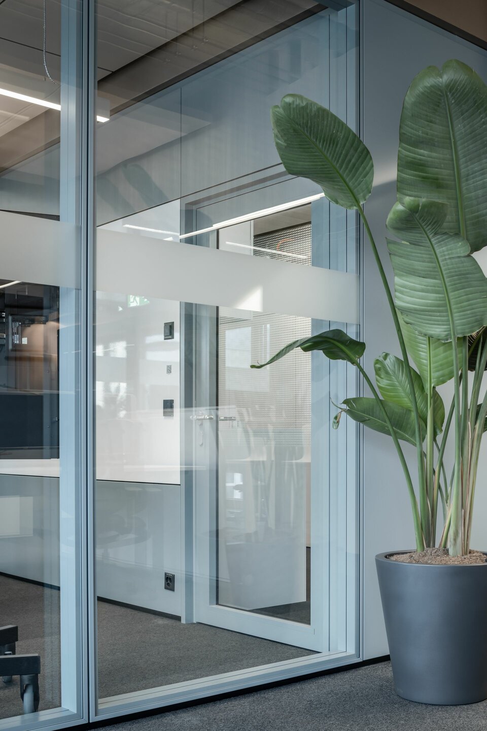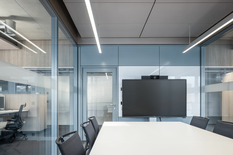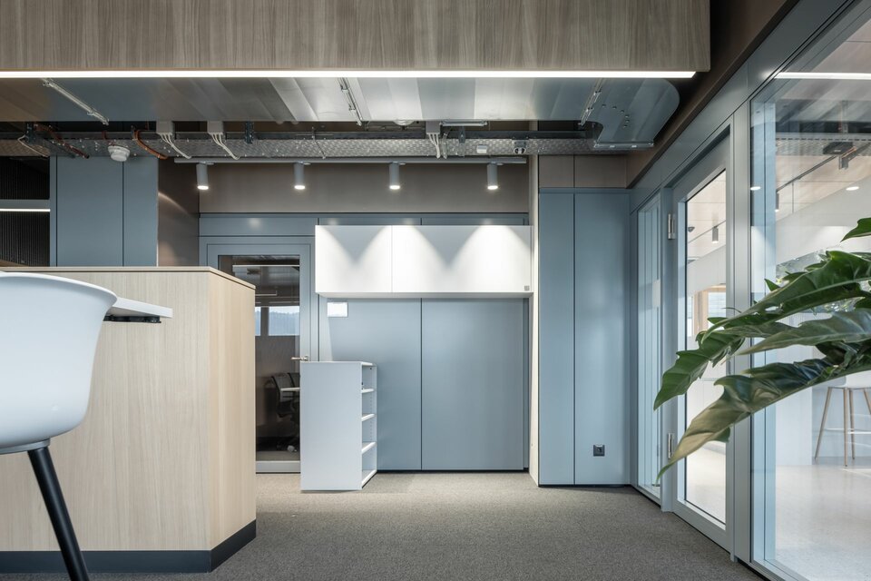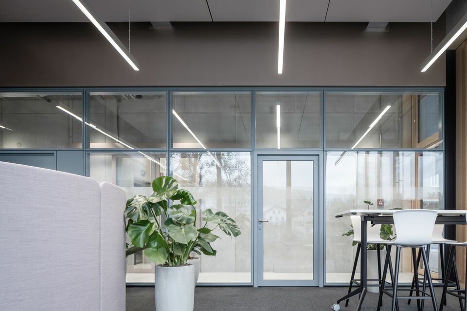 For the interior fit-out, Lindner SE, Arnstorf | Opfikon Branch has significantly contributed to the appealing design with innovative wall systems. In particular, the extensive use of the Lindner Life Contour glass wall system with its oversized glass elements ensures light-flooded and inspiring work areas – where no compromises are necessary in terms of room acoustics thanks to high sound insulation values. Aluminium and wooden doors blend seamlessly into the design of the partition walls. Lindner also gave the office spaces a unique character with a special paint finish for the metal partition walls: in a complex and lengthy sampling process, the walls were given a blue powder coating with mica and glitter effects. Complemented by whiteboard wall panels, self-supporting plaster lintels and floor bulkheads, the ambitious building project was realised by Lindner within a tight period of just six weeks.