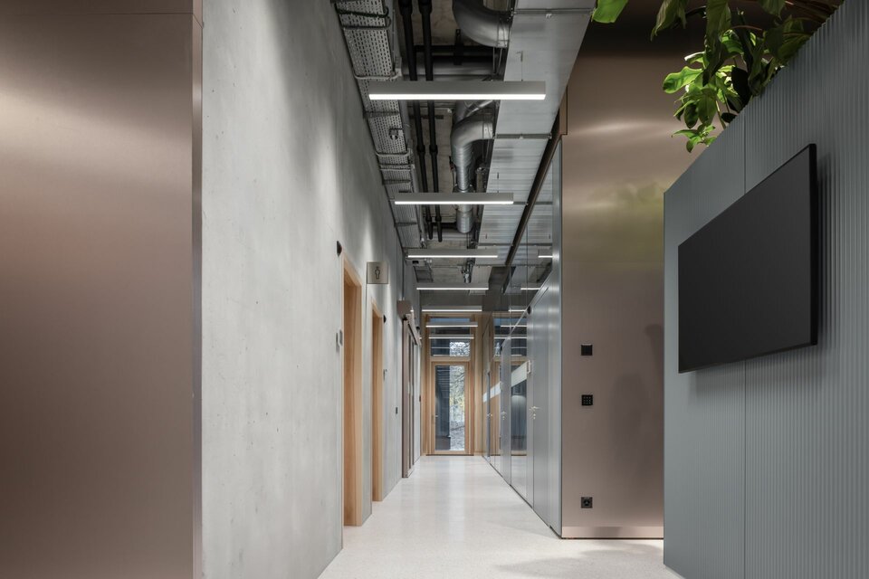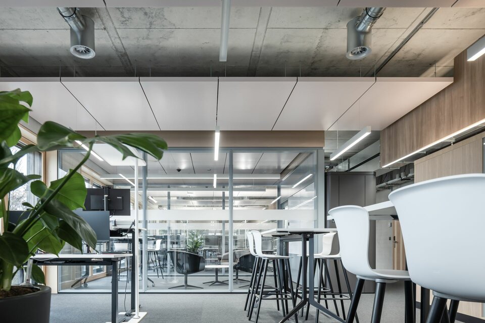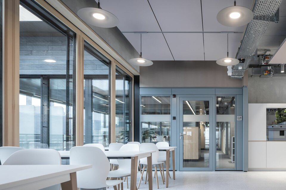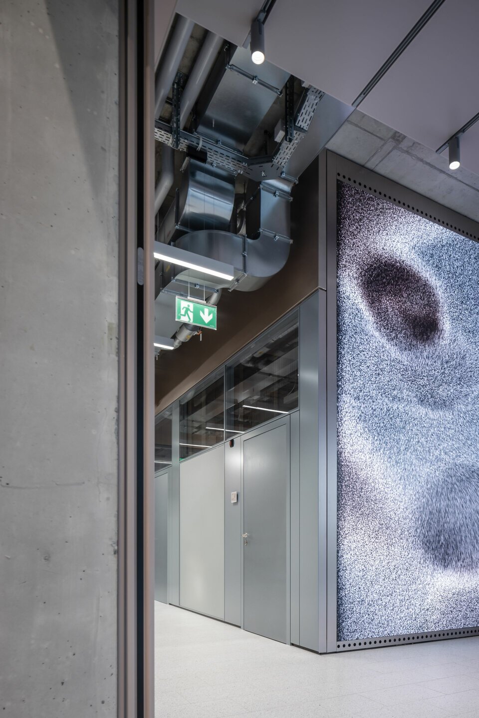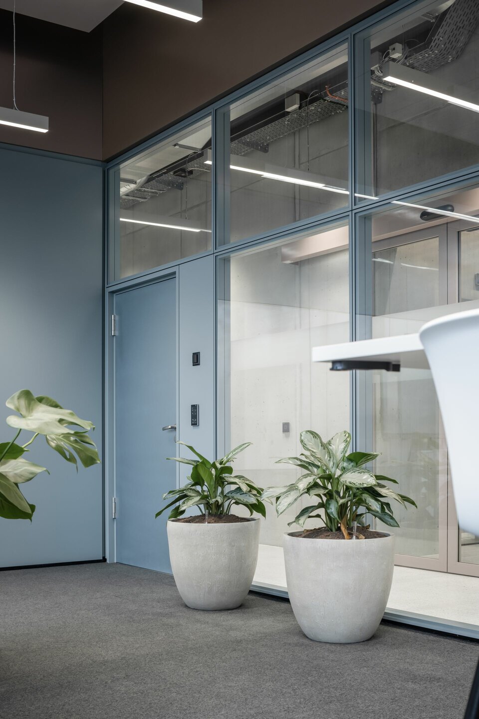 For the interior fit-out, Lindner SE, Arnstorf | Opfikon Branch has significantly contributed to the appealing design with innovative wall systems. In particular, the extensive use of the Lindner Life Contour glass wall system with its oversized glass elements ensures light-flooded and inspiring work areas – where no compromises are necessary in terms of room acoustics thanks to high sound insulation values. Aluminium and wooden doors blend seamlessly into the design of the partition walls. Lindner also gave the office spaces a unique character with a special paint finish for the metal partition walls: in a complex and lengthy sampling process, the walls were given a blue powder coating with mica and glitter effects. Complemented by whiteboard wall panels, self-supporting plaster lintels and floor bulkheads, the ambitious building project was realised by Lindner within a tight period of just six weeks.