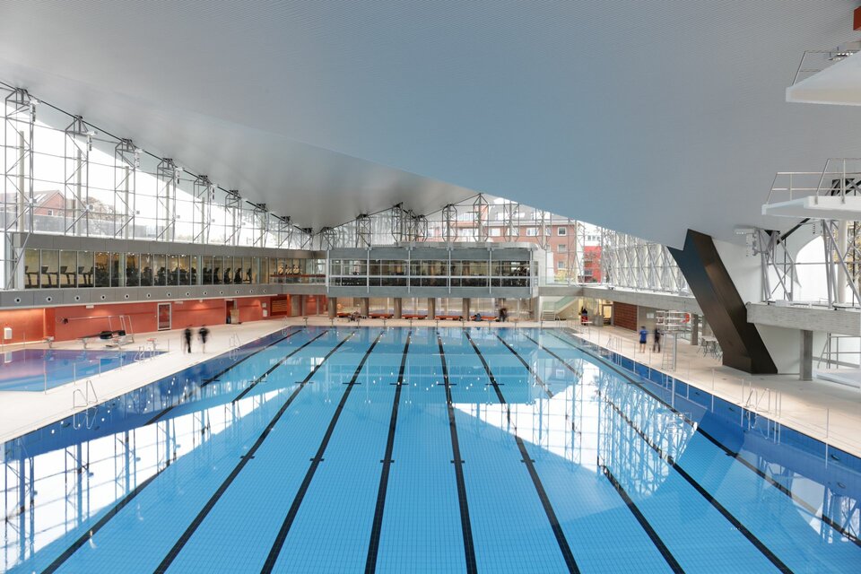 From 2020 to 2023, the listed building underwent extensive renovation and expansion, with Lindner also involved in the construction of a special ceiling made of three-dimensionally shaped aluminium panels. A number of hurdles had to be overcome in order to reconcile the conflicting demands of a listed building with the requirements of a modern swimming hall. In addition to the heritage and anti-corrosion requirements, the new ceiling could only be attached to the existing boreholes in order to accommodate the shell roof. The roof shell and existing boreholes were digitally recorded in a very complex survey, and the aluminium ceiling was then shaped into a hyperbolic paraboloid in a separate 3D design. Lindner also clad the parapet bands with monolithic C-shaped panels made from LinCrete, a highly durable and resistant glass fibre concrete. These were matched in colour and texture to the existing fair-faced concrete structures so that the cladding blends seamlessly into the appearance of the pool.