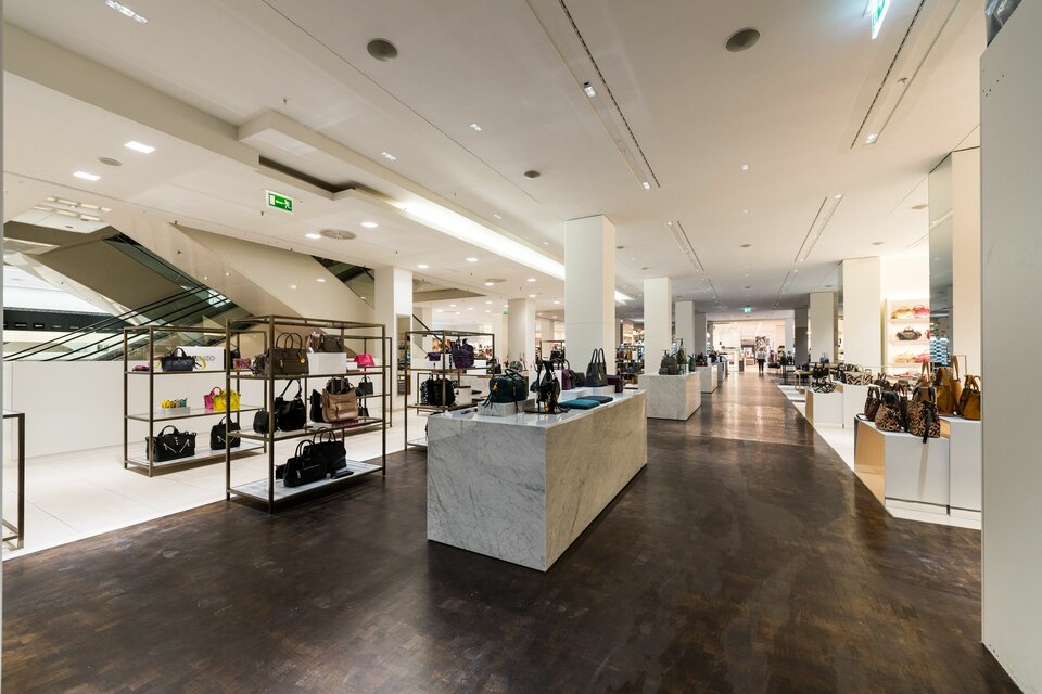 For over 100 years, the Alsterhaus has been a premium shopping centre at the Jungfernstieg of Hamburg. Through and investment of € 80 million, the proprietor KaDeWe Group has prepared the building´s future as Hamburg´s leading shopping location. This development immediately occurs to guests after stepping into the new entrée, the Accessoires Hall. It is situated in the area of the former atrium, which was completely redeveloped for this purpose. The former gallery on the first floor has been dismantled and architecturally melted with the ground floor. The area measures about 3,000 sqm and shows a luxurious, yet decent appearance. Ten shops with a focus on clothing and accessoiries have been set up in the Accessoires Hall.