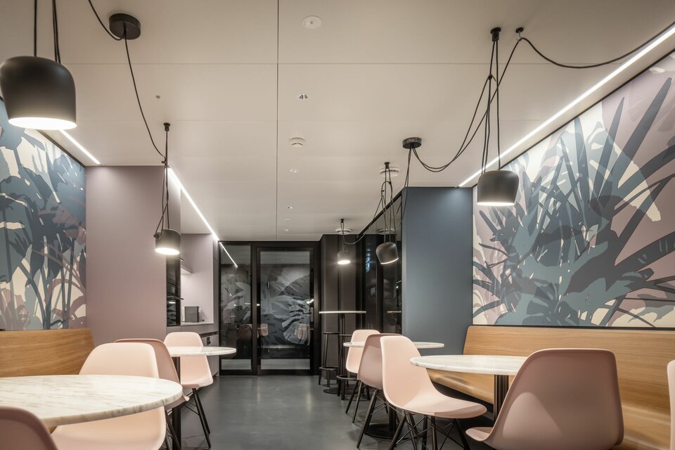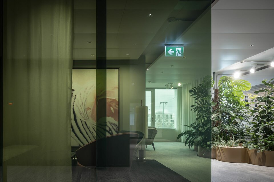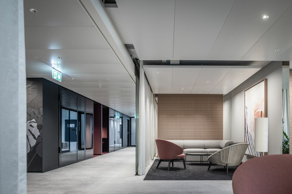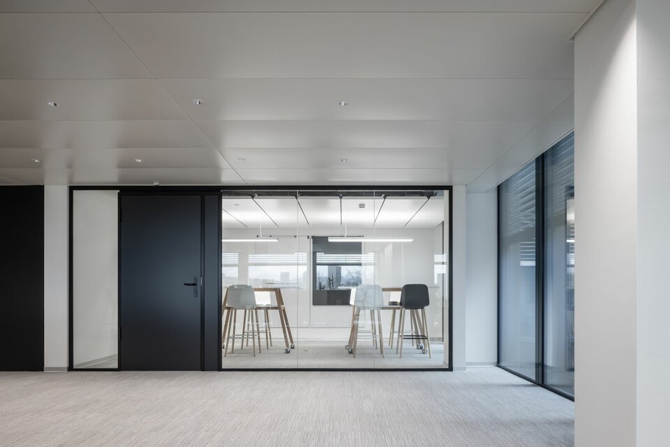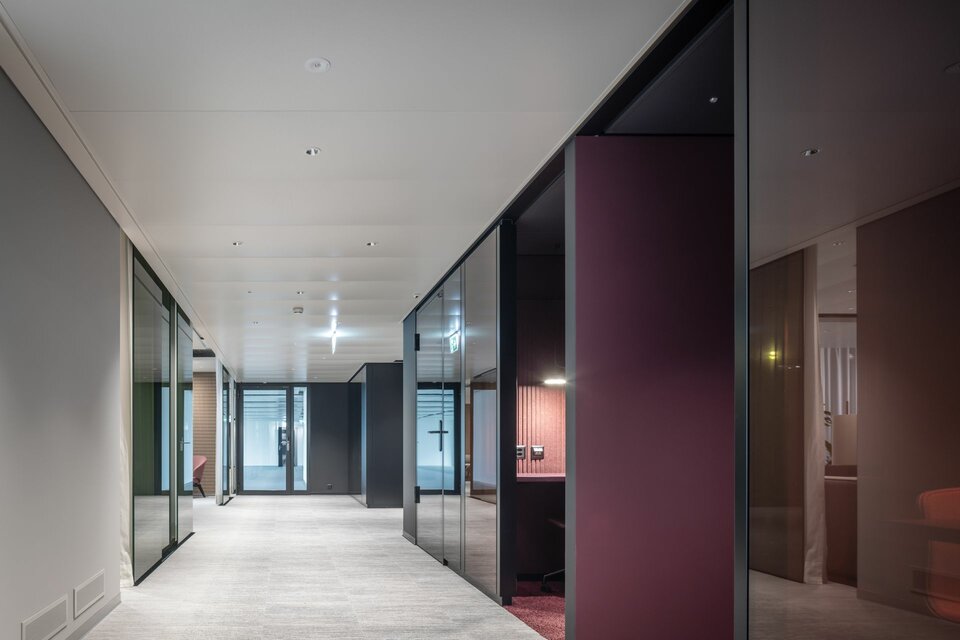 Lindner Life Freeze and Life Pure provide spatial division on the fourth floor: The system partition walls can be repositioned and installed individually, allowing for flexible room configuration that meets all user demands. Colourful glazing in red, green and black ideally complements the modern and open design of the offices, creating unique highlights. Suitable acoustic glass doors ensure a pleasant acoustic environment and undisturbed atmosphere, perfectly complementing the system partition walls.