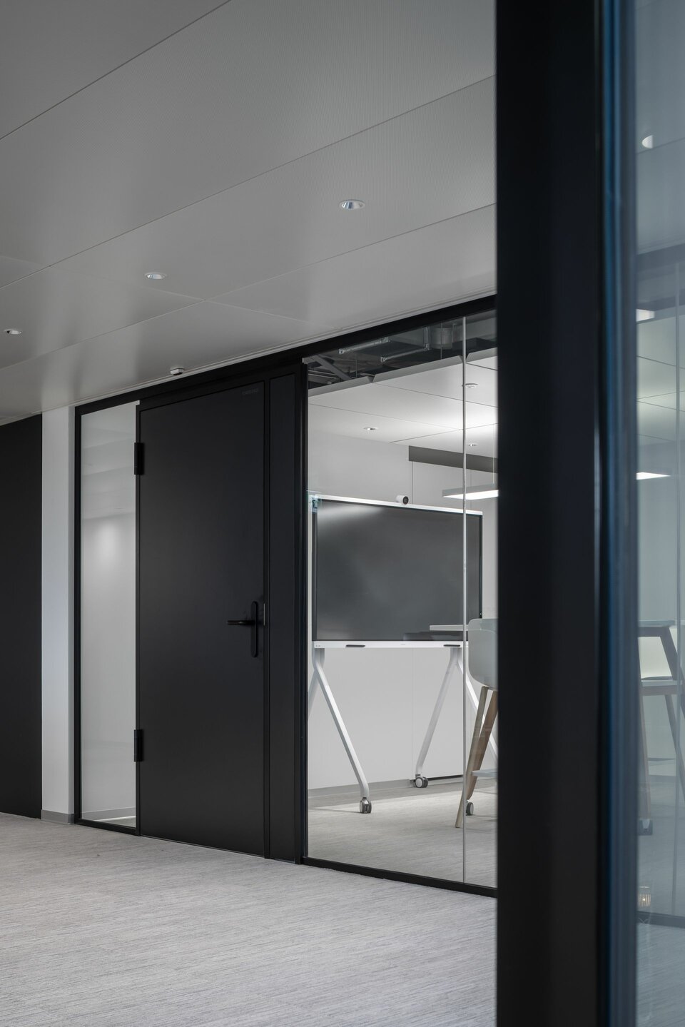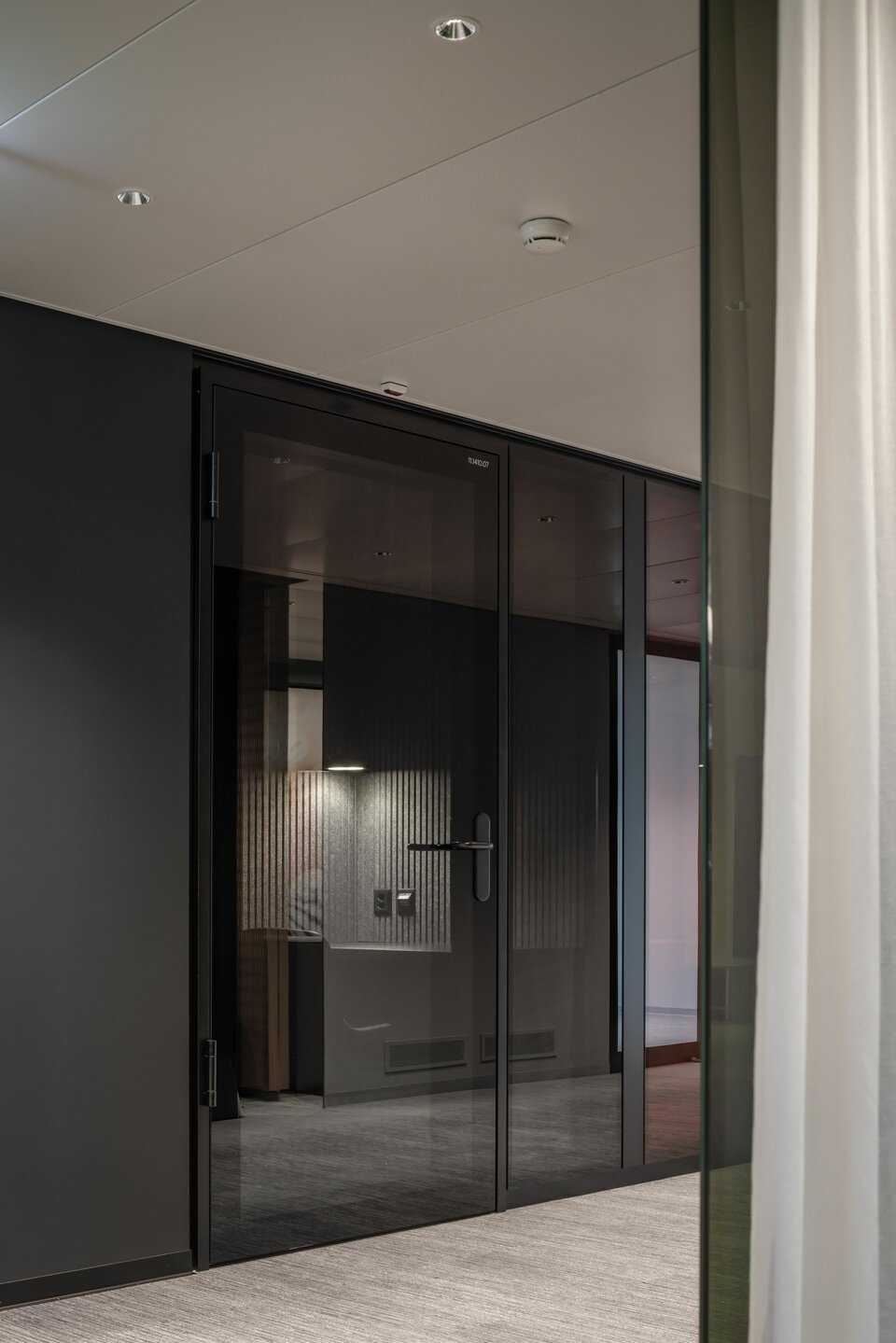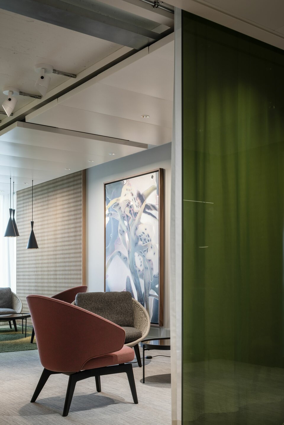 Lindner Life Freeze and Life Pure provide spatial division on the fourth floor: The system partition walls can be repositioned and installed individually, allowing for flexible room configuration that meets all user demands. Colourful glazing in red, green and black ideally complements the modern and open design of the offices, creating unique highlights. Suitable acoustic glass doors ensure a pleasant acoustic environment and undisturbed atmosphere, perfectly complementing the system partition walls.
