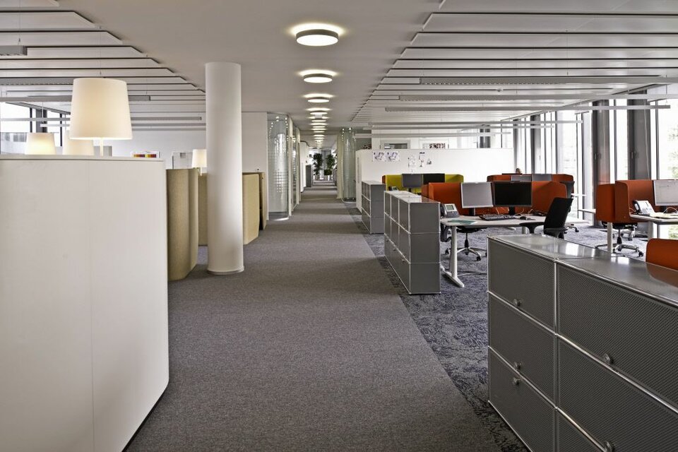 As a part of the new construction, Lindner was contracted with the production and installation of hollow and raised floor systems. Large areas of the building have been gentrified in this way. The event areas and the restaurant of the main building´s ground floor have been fitted with parquet-coated FLOOR and more® hollow floors, while the office areas have been mainly fitted with NORTEC raised floors and carpet coating. Furthermore, CAVOPEX comfort hollow floors with integrated heating technology are used to control the temperature in the interior passageway spanning over the inner courtyard. The adjoining structure´s appearance differs in regard of the flooring systems. There, large-format (1.2 by 1.2 m) ceramic tiles have been laid on the whole floor area of the structure while applying the innovative DryMode laying method. This procedure requires neither primer nor adhesives, which saved a large amount of time in comparison to other tiling methods. NORTEC raised floors have been used as a substructure for the tiling in this project.