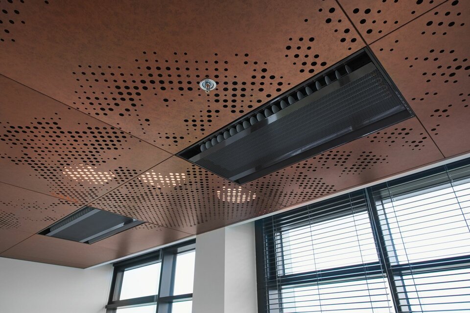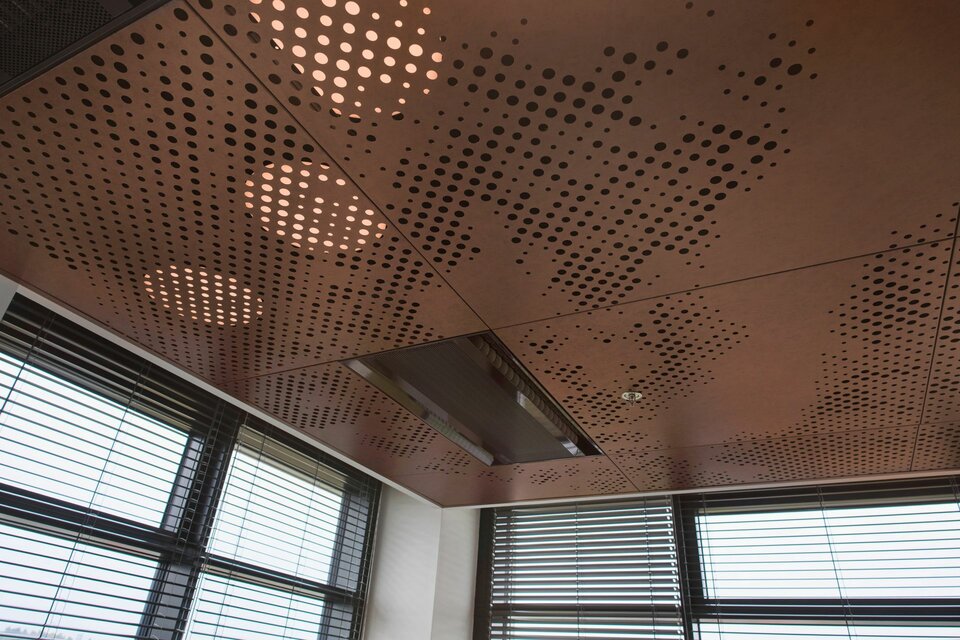 The Lindner Group made a significant contribution to the interior design with a project-specific ceiling solution: the entire LMD ceiling system made of perforated metal panels takes on the shape of a world map thanks to the SPREADline scatter perforation, becoming a highlight of the business centre. In addition, the copper ARTline surface gives the room an elegant and impressive look and creates a special feel-good atmosphere. This interplay of design and function creates a professional working atmosphere with aesthetic appeal.
