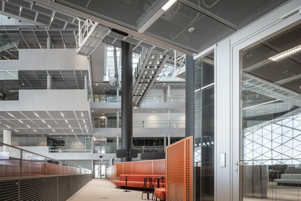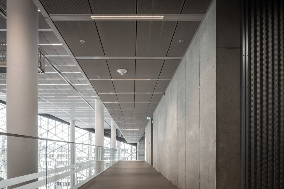 Lindner floor and ceiling systems, among others, were used for a well-functioning spatial implementation of the new working environments. For example, it was decided to use different versions of the NORTEC raised floor system or the hollow floor FLOOR and more® in order to conceal miles of IT lines, fire barriers etc. in the floor over a large area. The expanded metal ceiling systems also functionally complement the room concept: integrated heating and cooling elements ensure efficient and constant temperature control, and the central suspensions also include luminaires, sprinklers and presence detectors. In addition, Lindner also implemented many of the individual design requirements, such as gold-coloured metal cladding in the access areas of the lifts, which create a visual reference to the adjacent Axel Springer high-rise building with its gold-coloured facade. Dry construction elements, other wall and ceiling panelling as well as doors were also adapted to the high-quality material and colour concept in the new Axel Springer building and in part individually manufactured by Lindner.