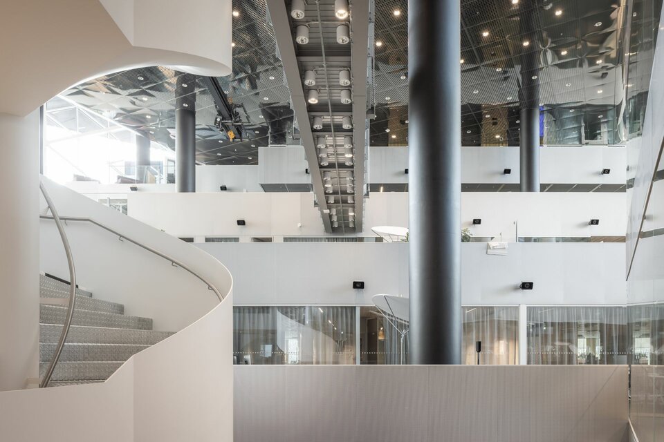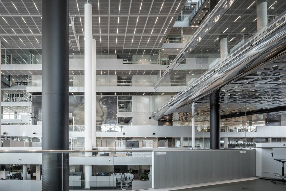 With the new Axel Springer building, directly adjacent to the "golden" publishing building, the media and technology company is not only expanding its location in the heart of Berlin, but is also making an architectural statement here in relation to a new corporate culture. The futuristic-looking building, designed by Rem Koolhaas and his office OMA Rotterdam, embodies Axel Springer's transformation into a digital media house and offers the best conditions for new, interactive working methods. One of the highlights is the terraced, 45-meter-high atrium, with partly public areas and gastronomy, work and meeting points and generous visual contacts to Berlin's public life. With flexible office and cooperation areas, the building offers space for approximately 3,500 employees, distributed over a total of 11 upper floors, including newsrooms, TV studios and a green roof area for working together and taking breaks under the open sky.