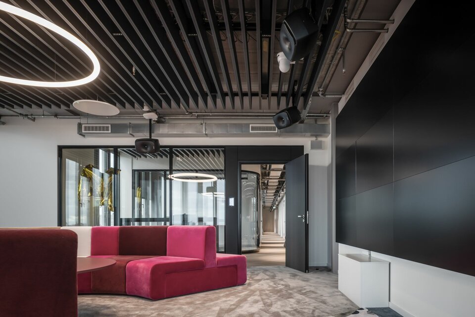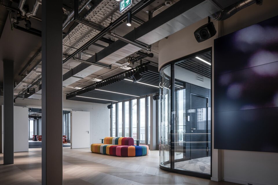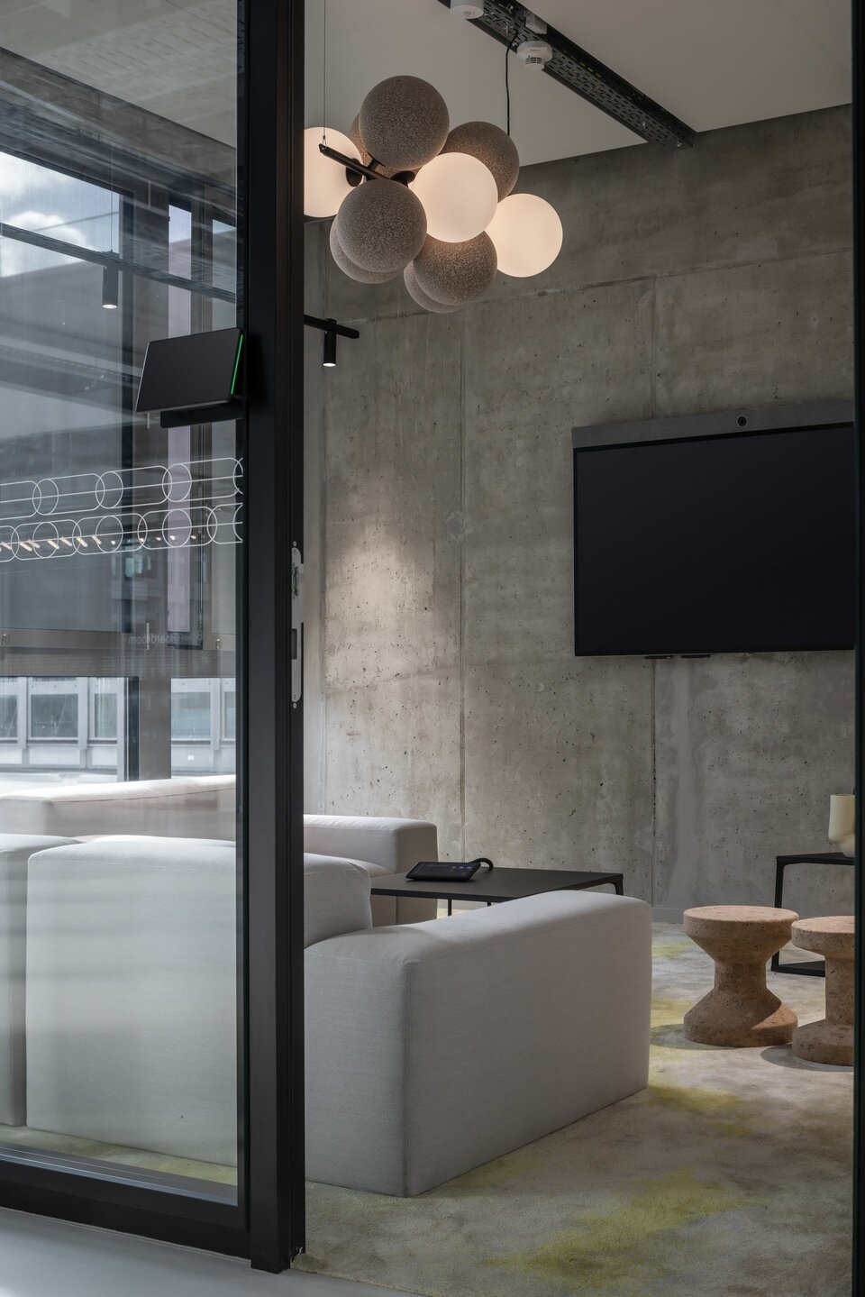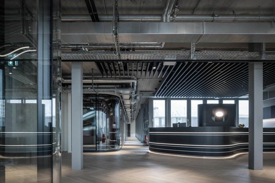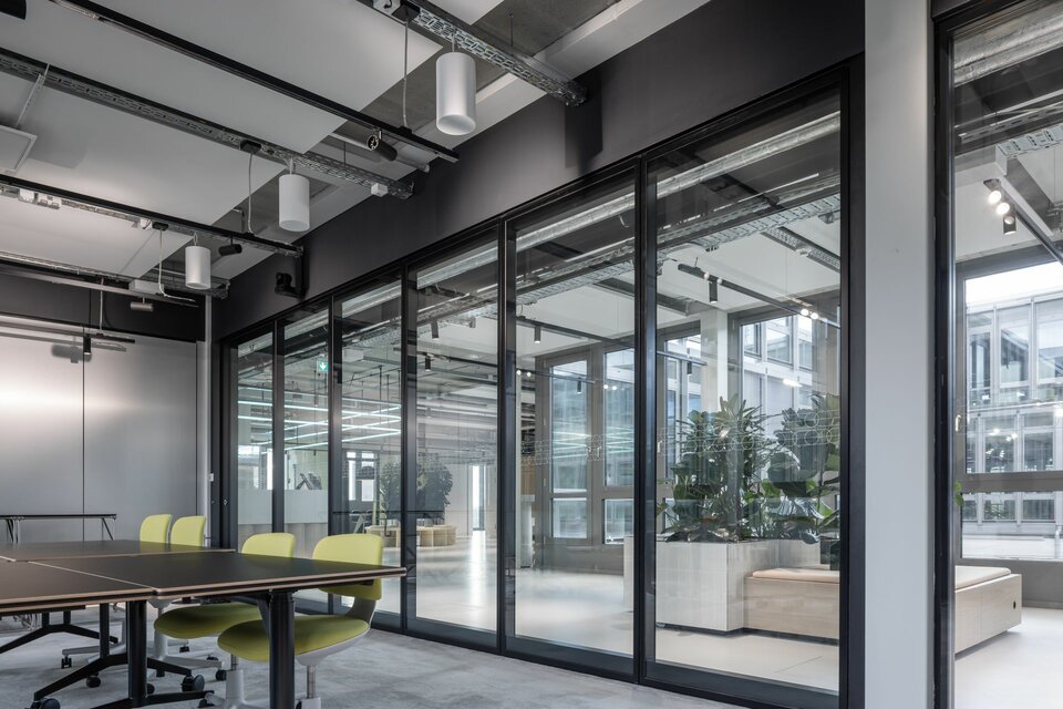 The Lindner Group played an important role in the revitalisation of the fifth, sixth and seventh floor with their divisions ceiling and walls. CBRE Design Collective itself was responsible for the interior design on the sixth floor. Focus of the remodelling was the arrangement of various small and medium-sized conference rooms: sound-insulated glass and metal partition walls provide the necessary division and acoustics and form a transparent and open finish to the front towards the hallways. Round glass elements in the partition walls are an additional eye-catcher while elegant wooden and glass doors underline the design. Thanks to the installation canopy and heated and chilled ceilings in slat optics, efficient temperature management inside the building is also ensured.