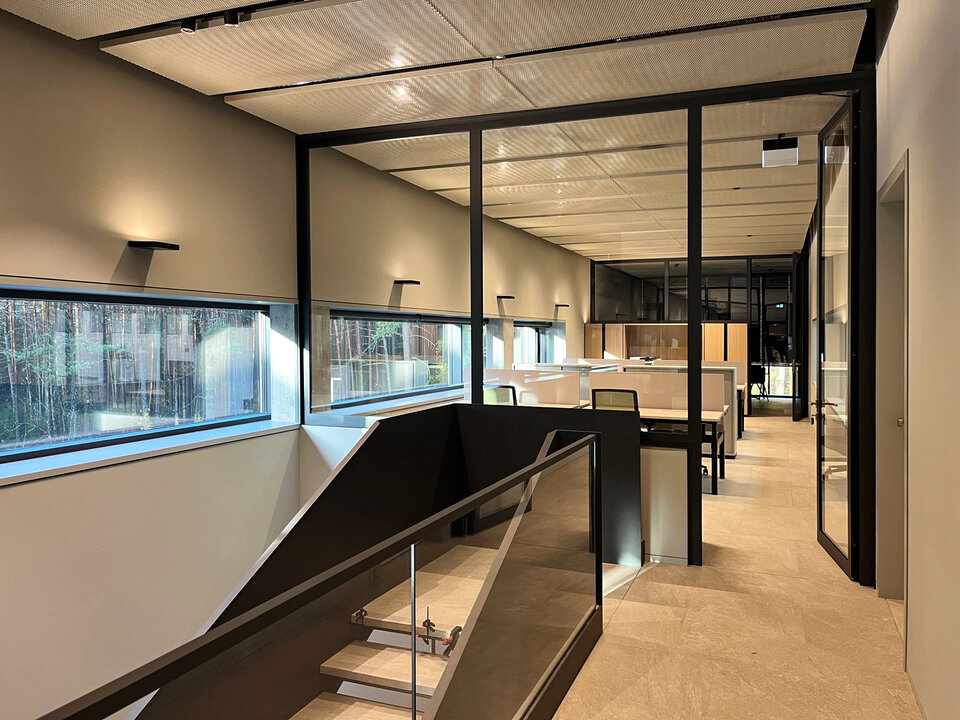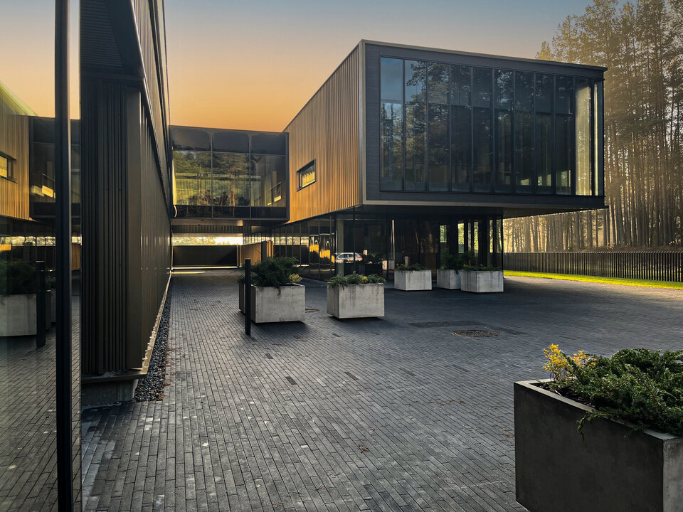 In 2024, a new state-of-the-art factory and laboratory complex was built at the company's headquarters in Lithuania, designed by Stupak architektų biuras. The building spans three upper floors with a gross area of 3,157 m². Large glass facades create an open and bright working environment with direct access to outdoor green spaces. The design not only prioritises visually appealing architecture but also ensures a functional, high-quality technical environment that meets Biotecha's specific requirements and work processes.