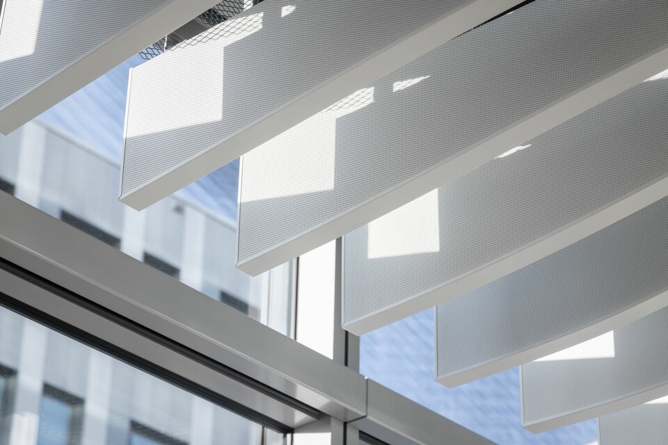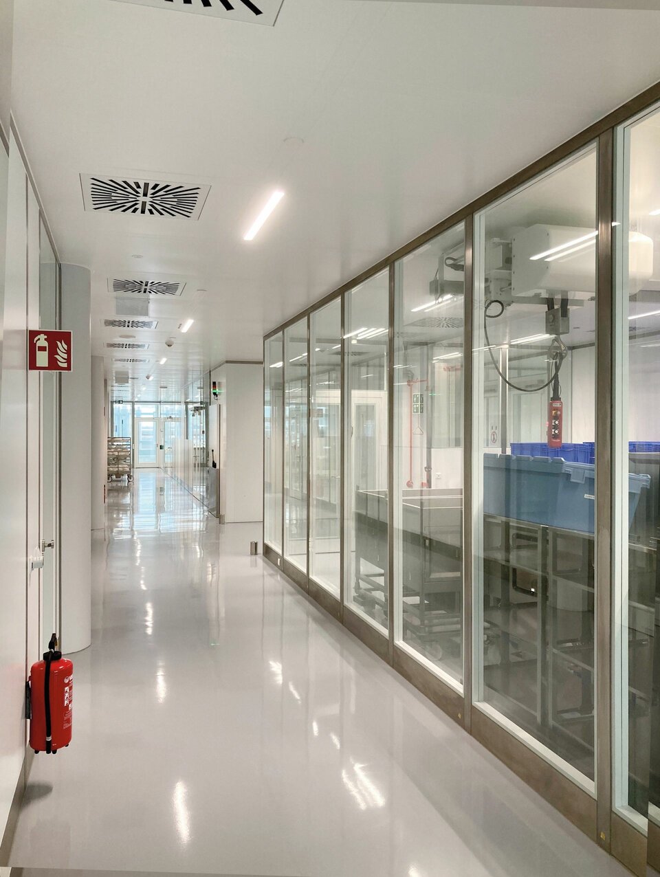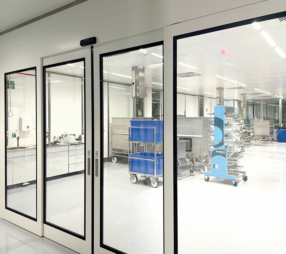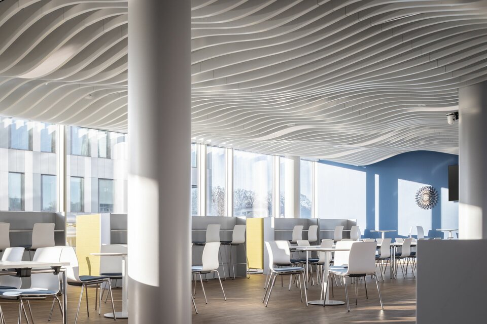 Lindner realised the interior fit-out of the office and clean rooms with high-quality ceiling and wall systems in order to meet both the aesthetic and functional requirements of the pharmaceutical company. The LMD-L LAOLA ceiling system with its wave-shaped slats creates a unique appearance and produces lively, three-dimensional effects. In the cleanroom areas, the Line 80S walk-on ceiling system with a visible width of 80 mm also makes it much easier to maintain the electrical and media supply in the research centre. The ceiling system is connected to the Lindner Pharma 80S wall system with wall shells made of high-quality stainless steel - specially developed for the high cleanroom requirements. The building is complemented by the double-leaf sliding door, which is fitted with a fixed leaf that functions as a revolving door: these not only provide sound and radiation protection, but also integrate seamlessly into the wall systems. They also ensure safe access to the research areas and contribute to a protected and controlled cleanroom climate.