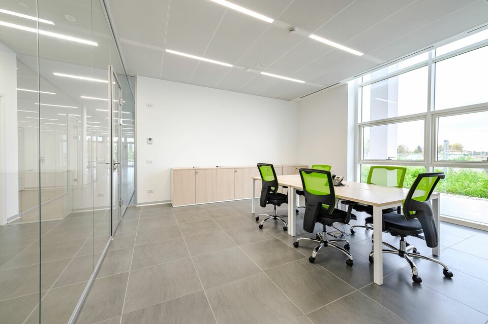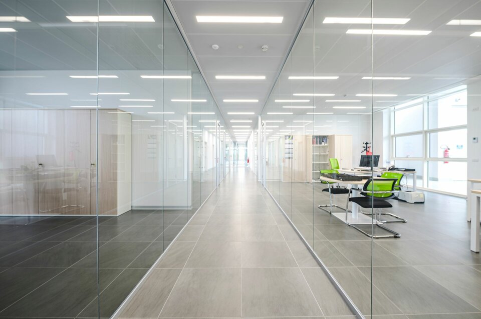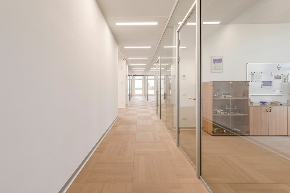 Acoustically effective Lindner ceiling systems including recessed luminaries as well as partition and door systems were installed throughout the office building. Powder-coated Metal Heated and Chilled Ceilings of the type Plafotherm® B 100 now ensure a pleasant temperature in both summer and winter. Exhaust and Supply Air Elements have been integrated into the ceiling system for the supply of fresh air and its distribution in the room. The Deep Matt Powder Coating MOODline creates a subtle and at the same time elegant surface and is insensitive to streak of light. The rooms are airy and bright thanks to the use of the Glass Partition Lindner Life Pure 620 in single glazing. It is complemented by fully glass sound insulated doors for optimal acoustics. Lindner luminaires provide additional light.