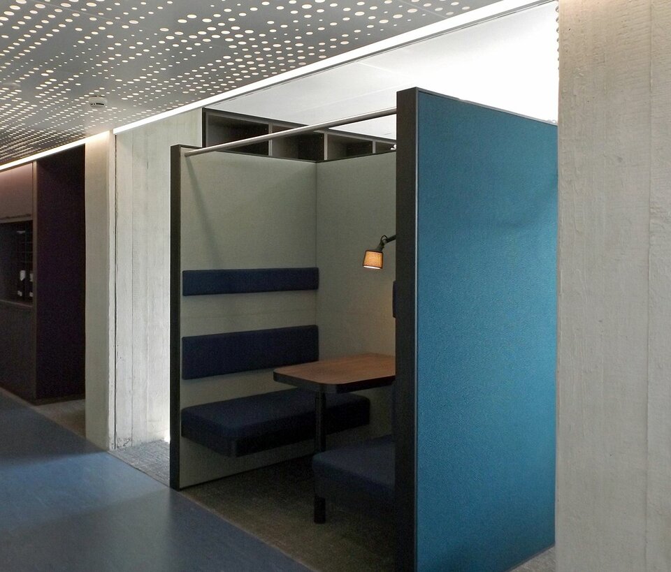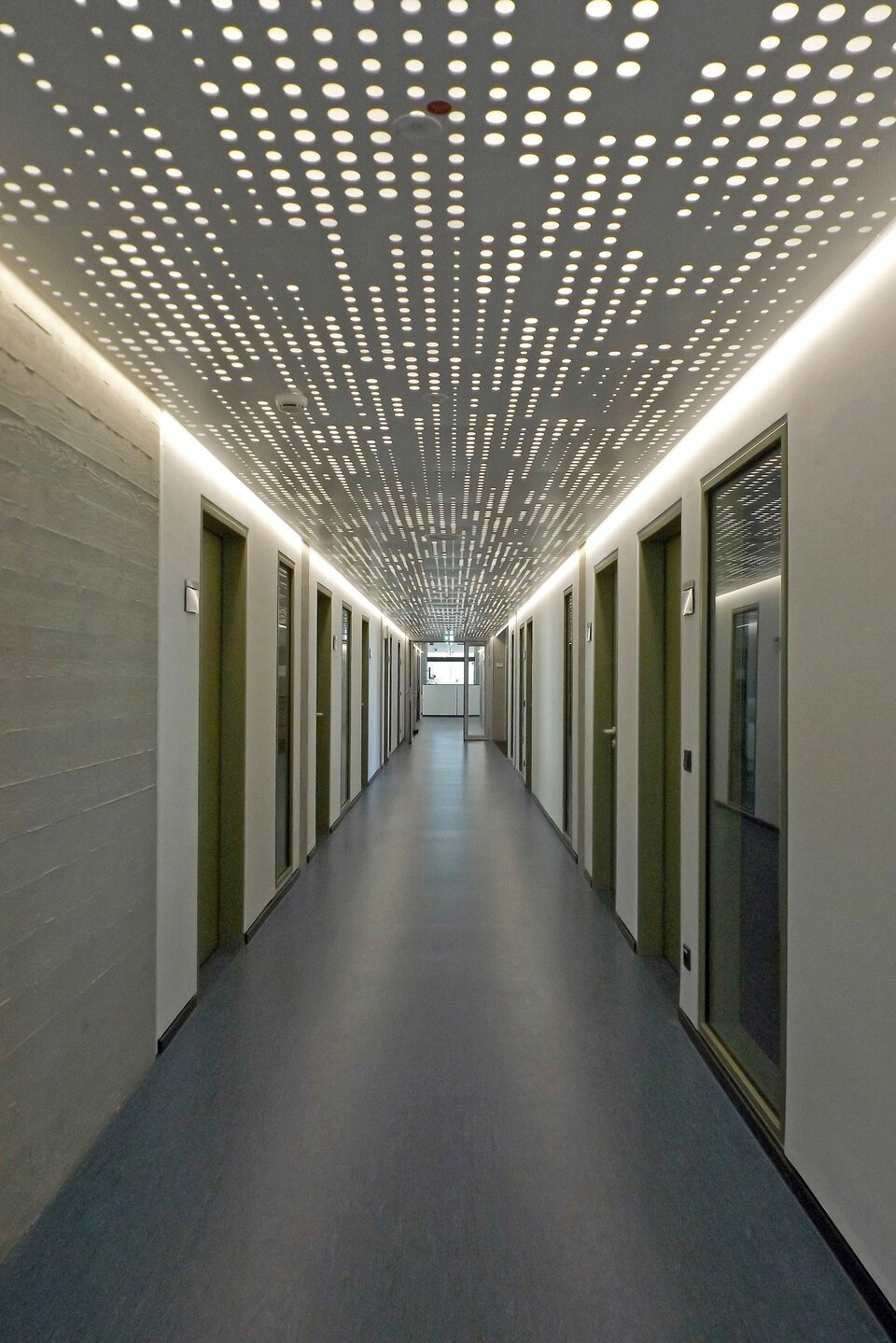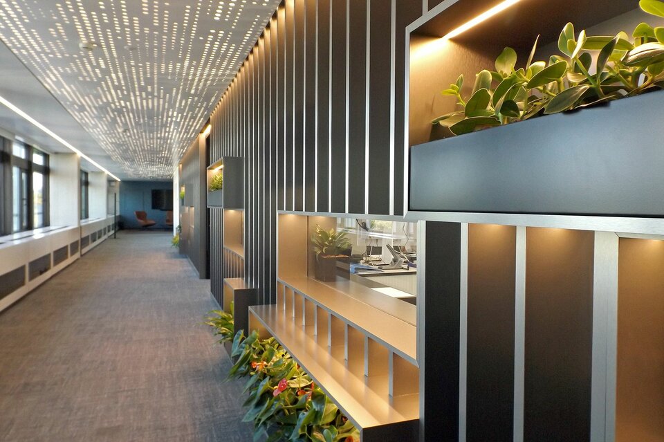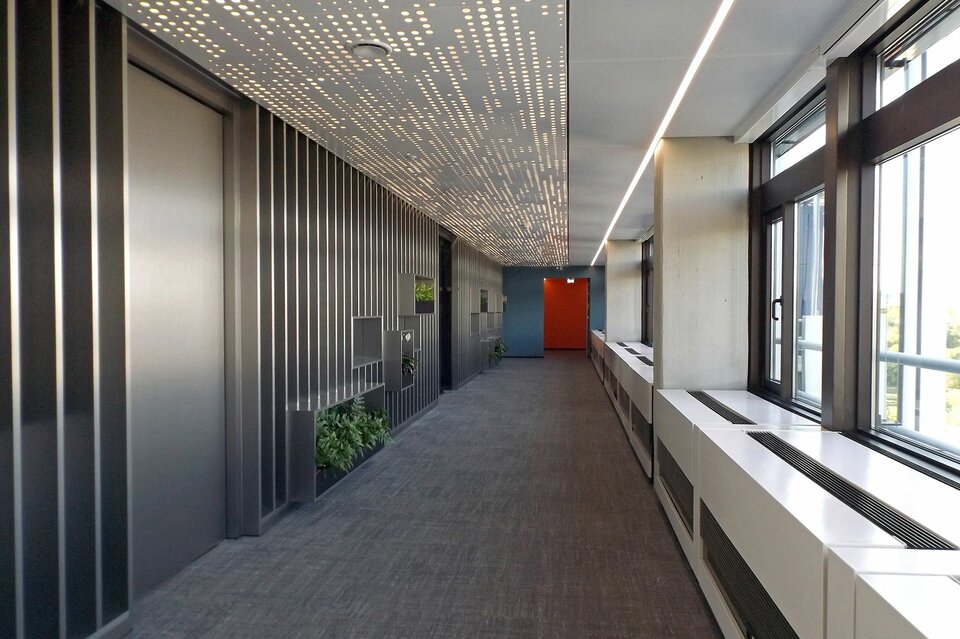 A special highlight is the translucent metal ceiling in the corridors, which was specially developed by Lindner in collaboration with the interior designers from the Ipolito Fleitz Group and Ernst² Architekten. The ceiling covers an area of 885 m² and stands out for its individually designed perforation and lighting, creating a special ambiance in the corridors. So-called light cannons, recesses in the ceiling, provide additional light transmission and optimal illumination. In the corridors, Lindner F30 plasterboard fire protection ceilings were also used, while heated/chilled ceiling systems were chosen for the office areas to ensure optimal room climate support.