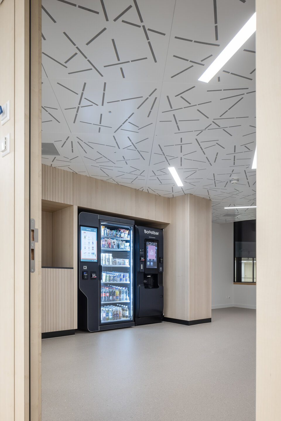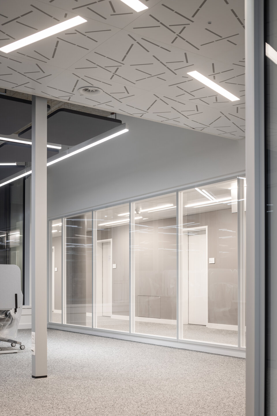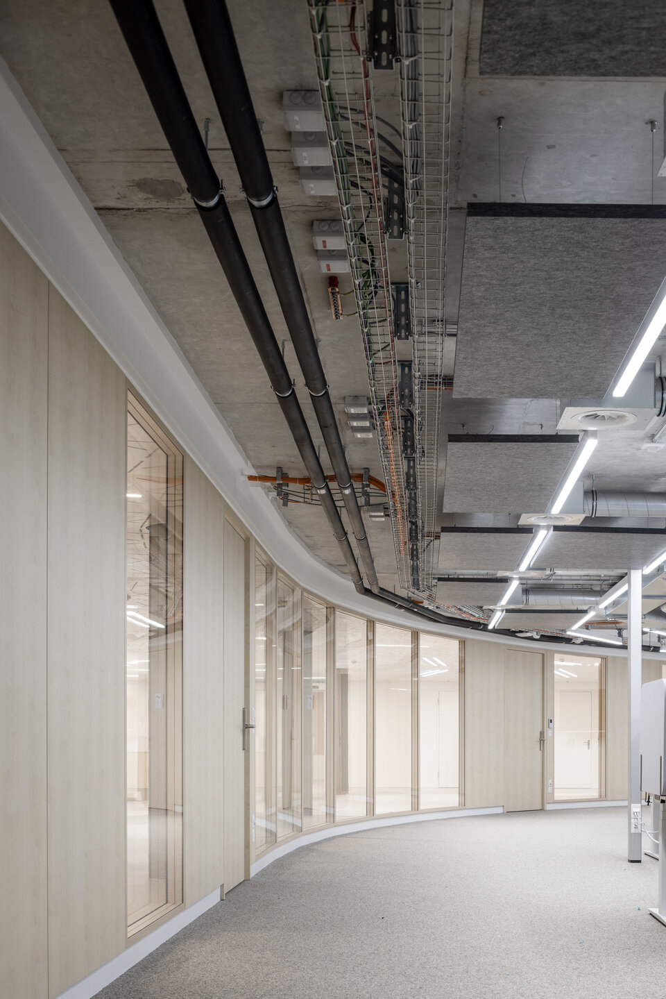 The ceiling solutions also reflect the highest quality standards: EI 60/EI 30 fire protection ceilings in the corridors ensure safety, while suspended MUTE+® skin acoustic absorbers provide optimal sound control. A true highlight, in every sense of the word, is the custom-designed LED lighting, seamlessly integrated into different corridor metal ceilings to create a optimal balanced lighting atmosphere. Custom-designed furniture for check-in and check-out areas, as well as coffee bars, complete the contemporary design concept. In technical rooms, Lindner raised floors provide ideal conditions and ample space for various installations, including electrical wiring and power supply systems.