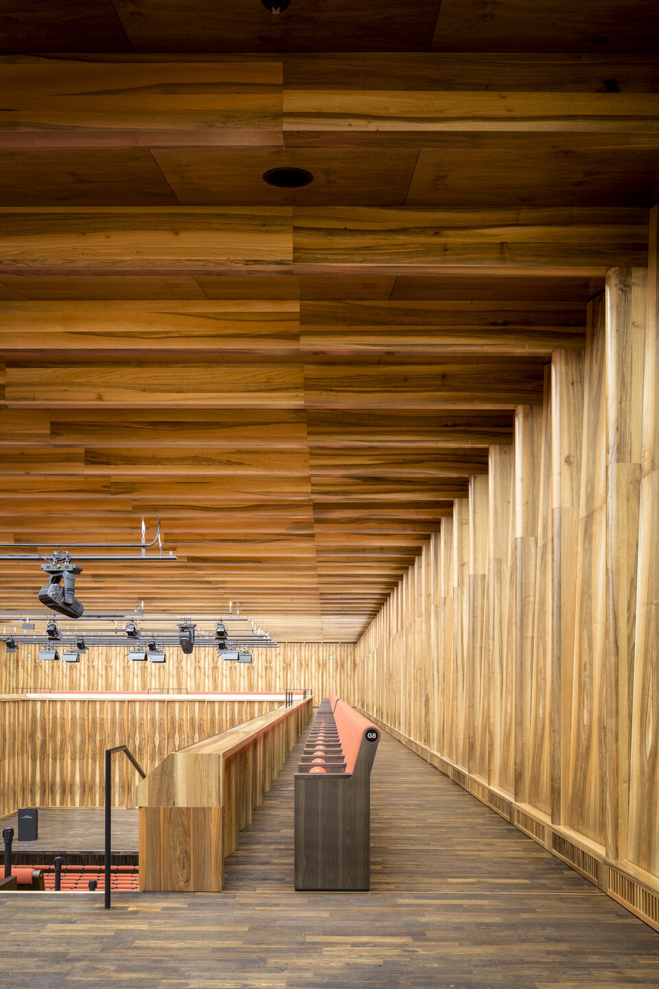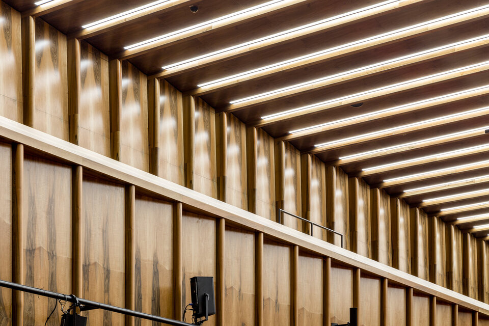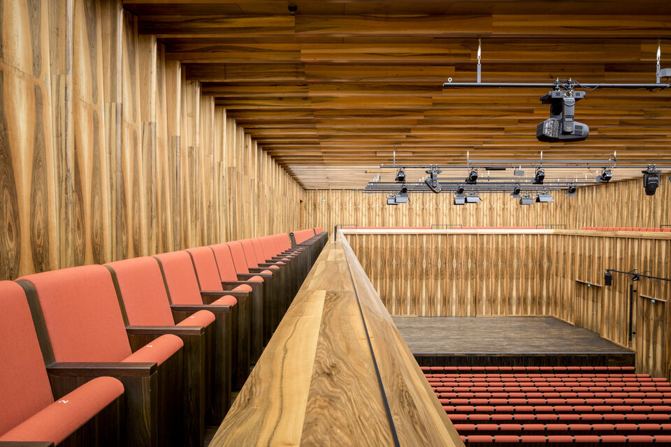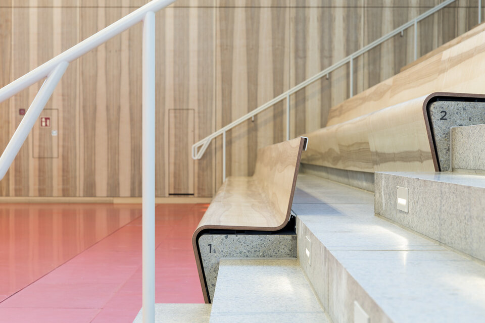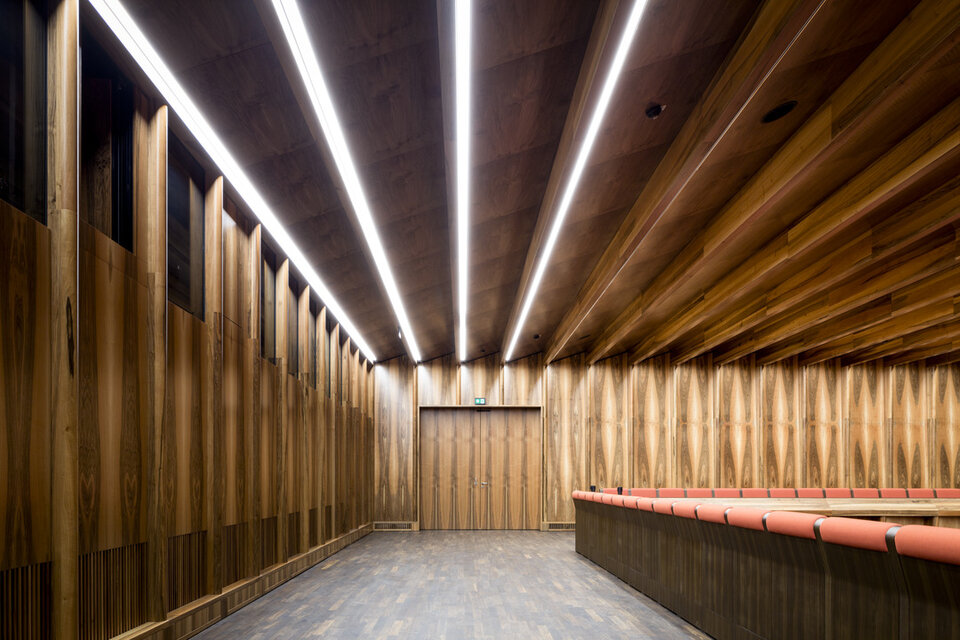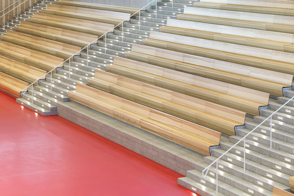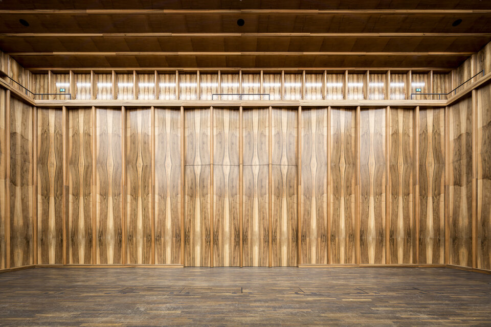While the Chamber Music Hall is a real eye-catcher at first glance, it also fascinates by its outstanding acoustics, which allows concerts without additional electronic amplification. Decisive for this are the wall and ceiling linings of the type FIREwood with European walnut surface produced and installed by Lindner AG, which were arranged in cooperation with the acoustics expert of Planegger Bauberatungsgesellschaft Müller-BBM. Following this design, the balustrades were also clad in the same way. Wooden doors and a gate complete the scope of the Lindner AG in the chamber music hall. In the main hall, Lindner-made benches made of bent ash plywood provide comfortable seating. The expanded metal ceilings installed in the foyer provide a structured contrast to the smooth floor in the company color red.