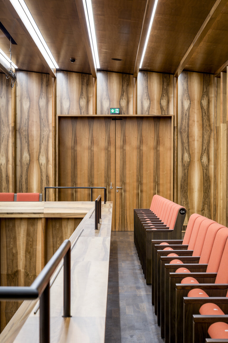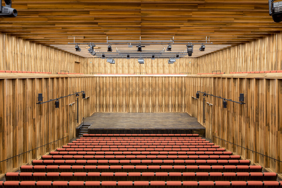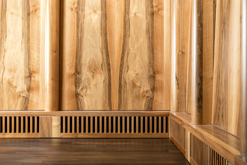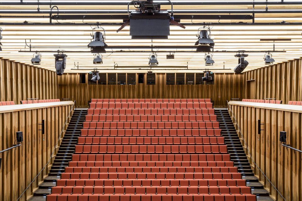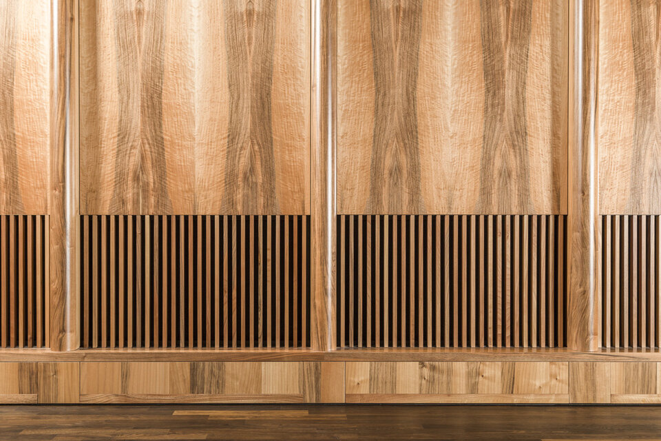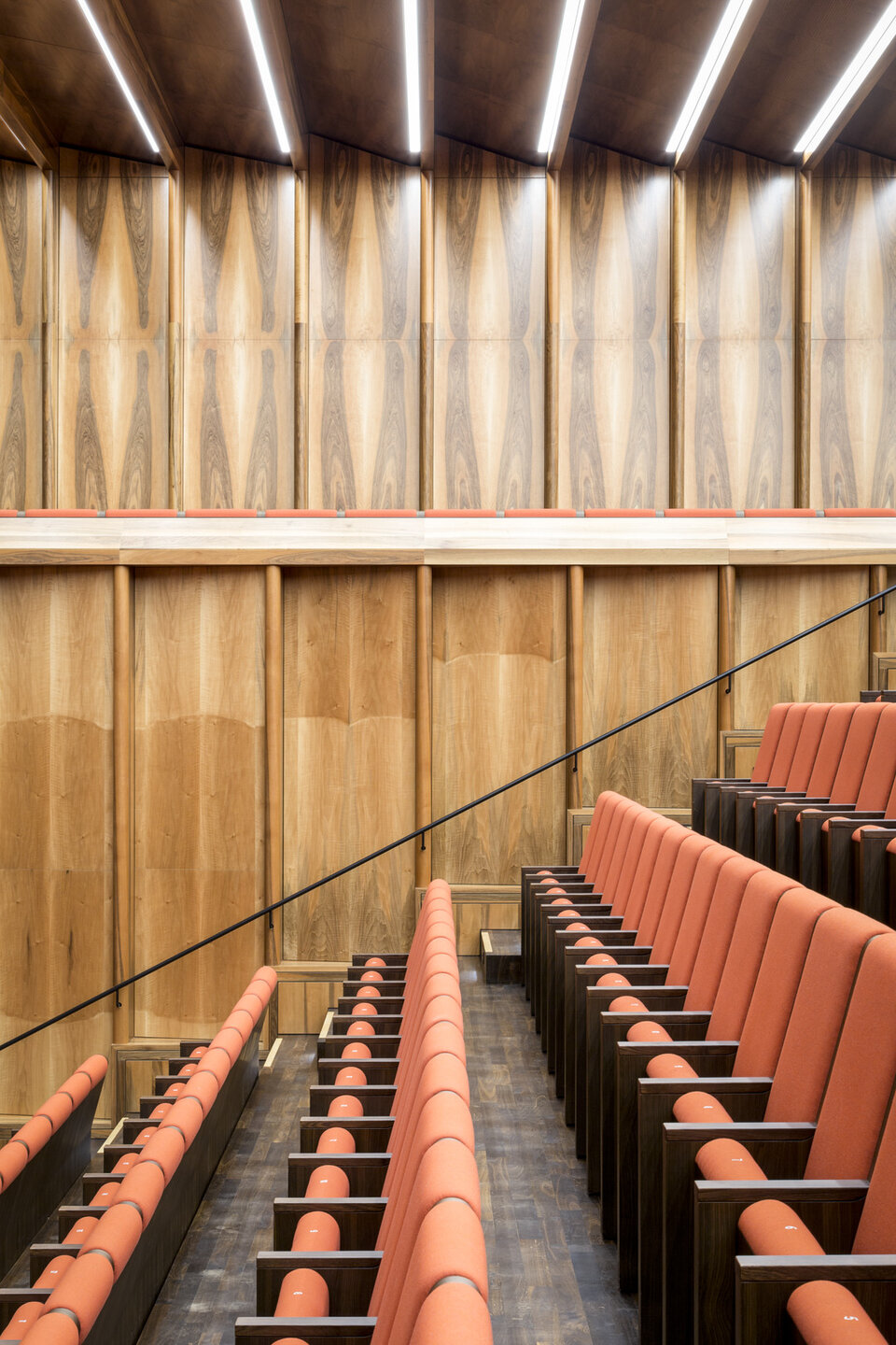 While the Chamber Music Hall is a real eye-catcher at first glance, it also fascinates by its outstanding acoustics, which allows concerts without additional electronic amplification. Decisive for this are the wall and ceiling linings of the type FIREwood with European walnut surface produced and installed by Lindner AG, which were arranged in cooperation with the acoustics expert of Planegger Bauberatungsgesellschaft Müller-BBM. Following this design, the balustrades were also clad in the same way. Wooden doors and a gate complete the scope of the Lindner AG in the chamber music hall. In the main hall, Lindner-made benches made of bent ash plywood provide comfortable seating. The expanded metal ceilings installed in the foyer provide a structured contrast to the smooth floor in the company color red.