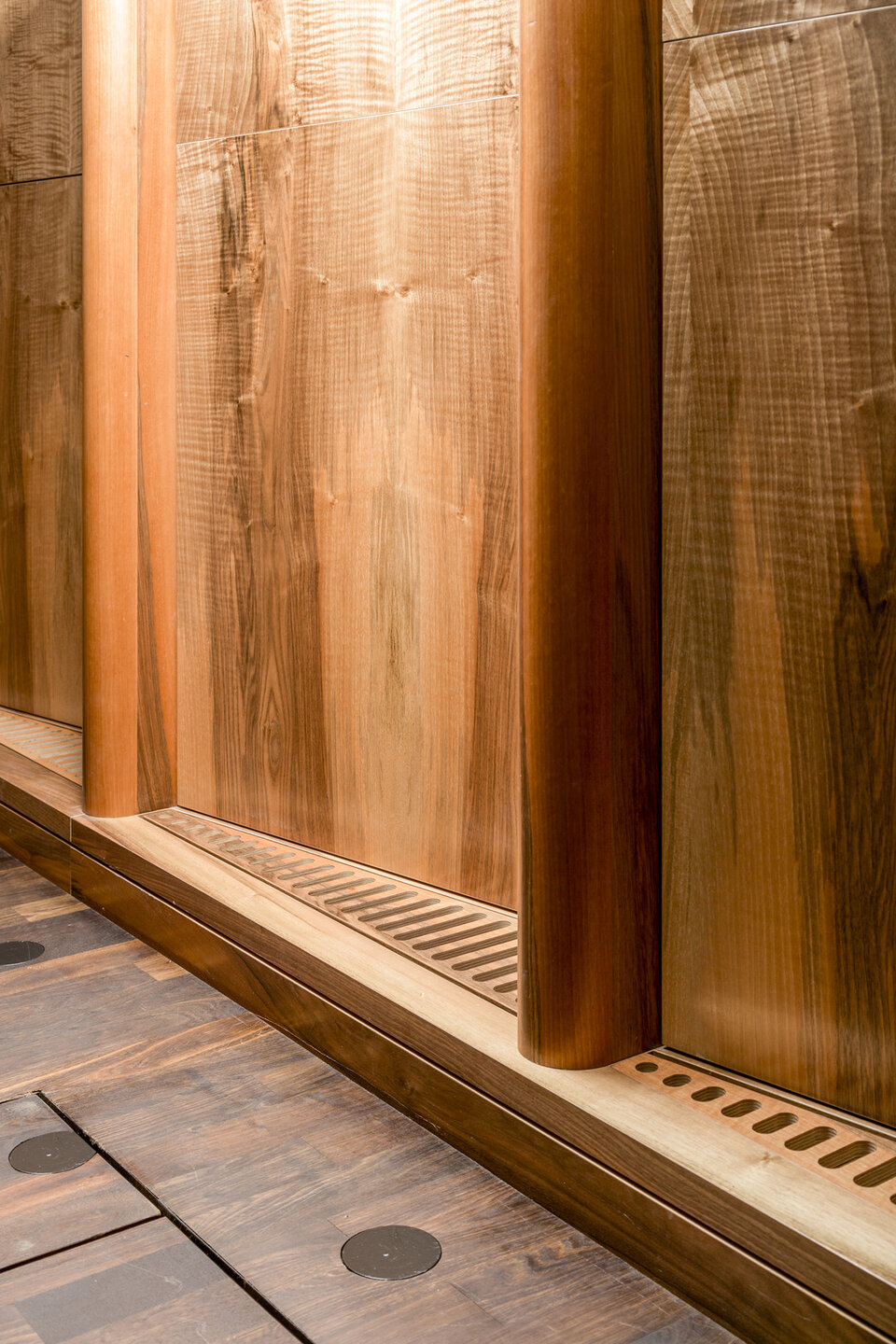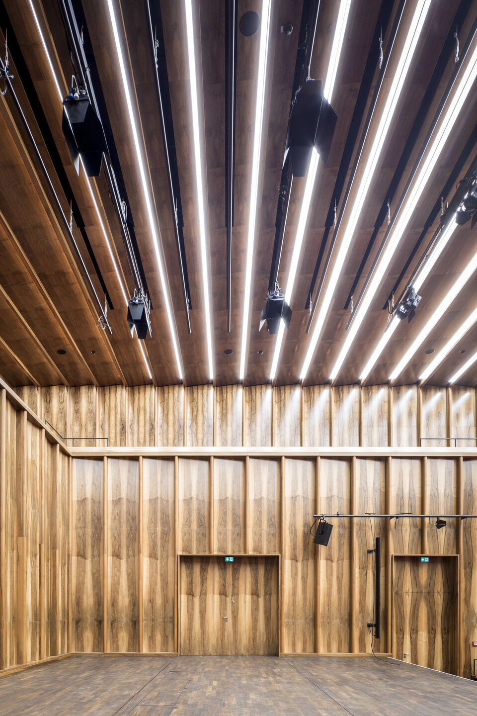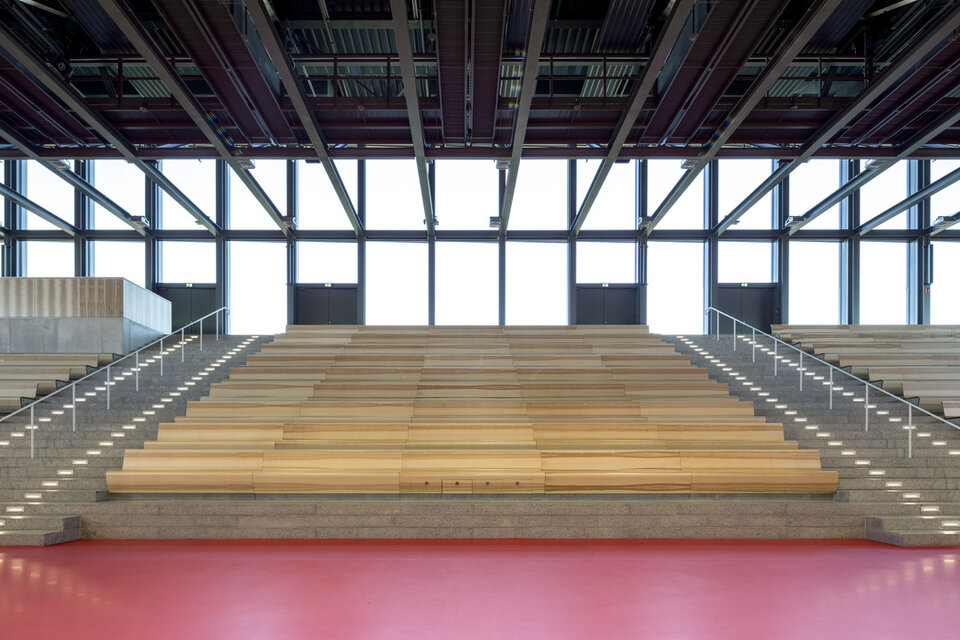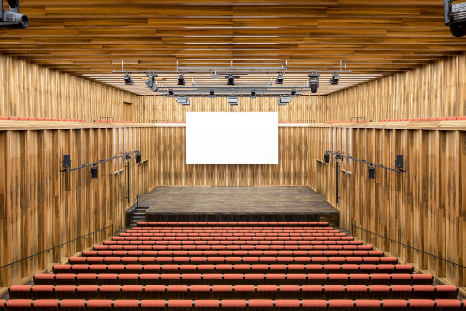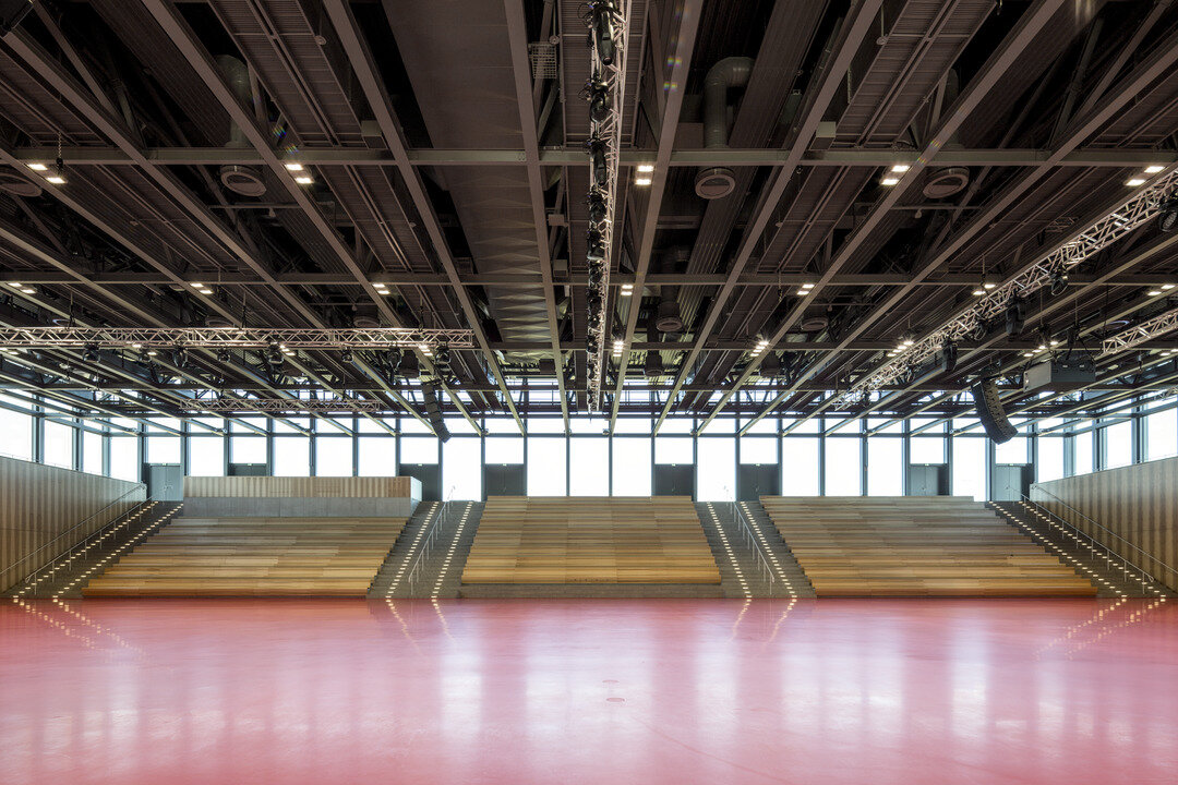While the Chamber Music Hall is a real eye-catcher at first glance, it also fascinates by its outstanding acoustics, which allows concerts without additional electronic amplification. Decisive for this are the wall and ceiling linings of the type FIREwood with European walnut surface produced and installed by Lindner AG, which were arranged in cooperation with the acoustics expert of Planegger Bauberatungsgesellschaft Müller-BBM. Following this design, the balustrades were also clad in the same way. Wooden doors and a gate complete the scope of the Lindner AG in the chamber music hall. In the main hall, Lindner-made benches made of bent ash plywood provide comfortable seating. The expanded metal ceilings installed in the foyer provide a structured contrast to the smooth floor in the company color red.