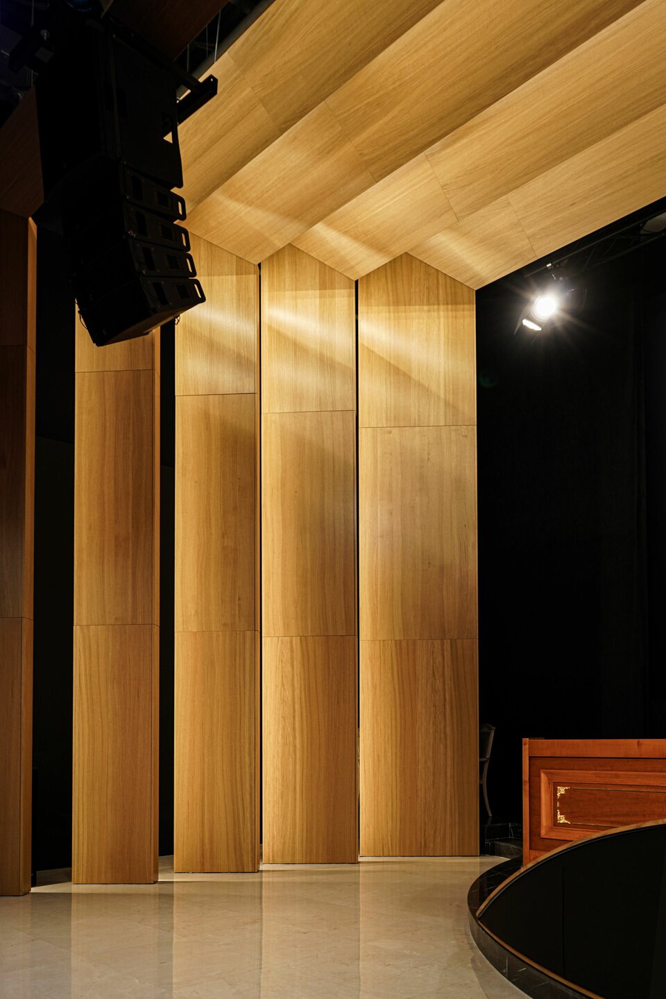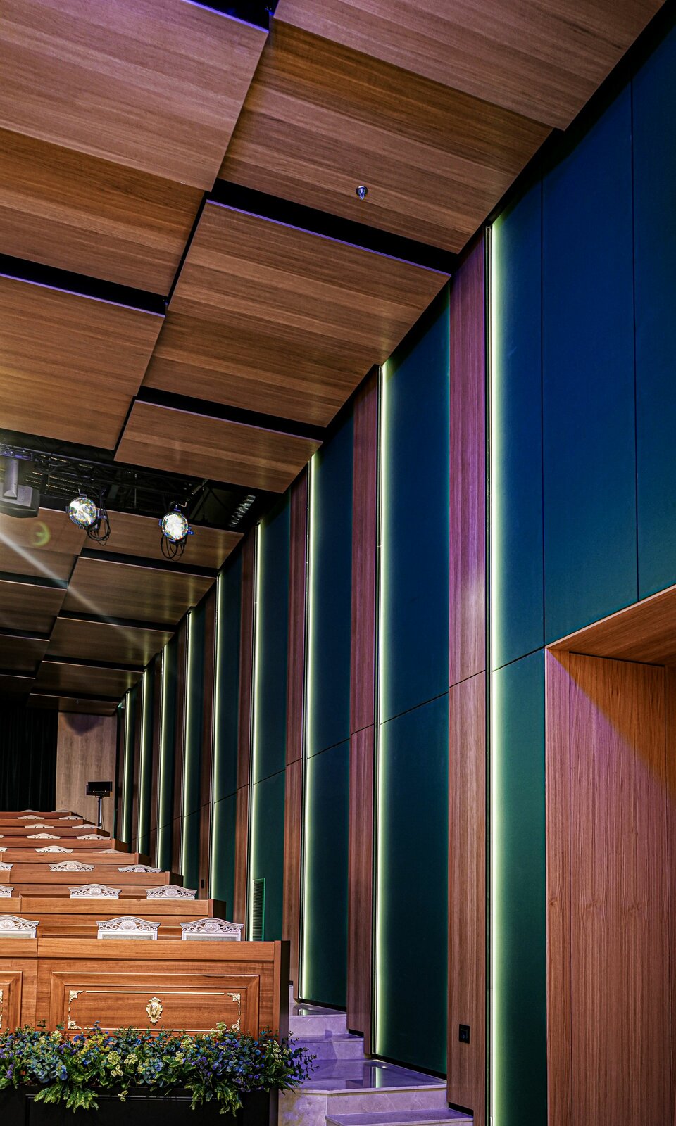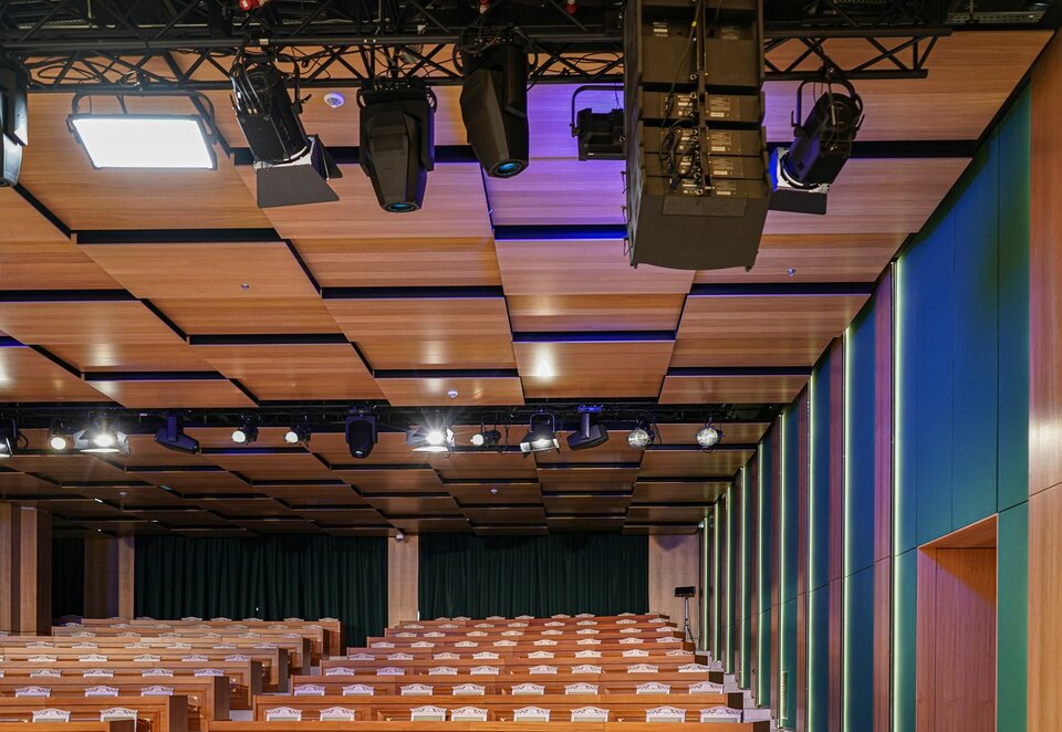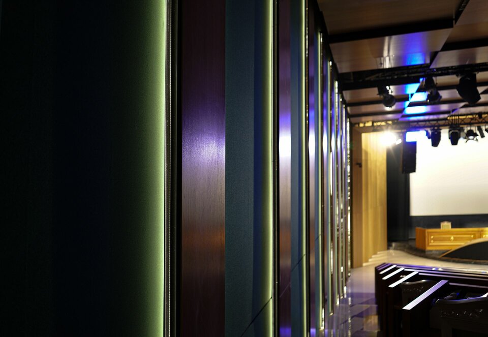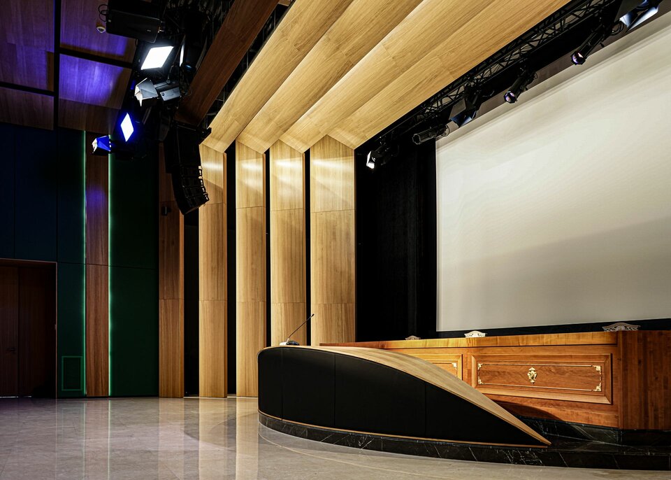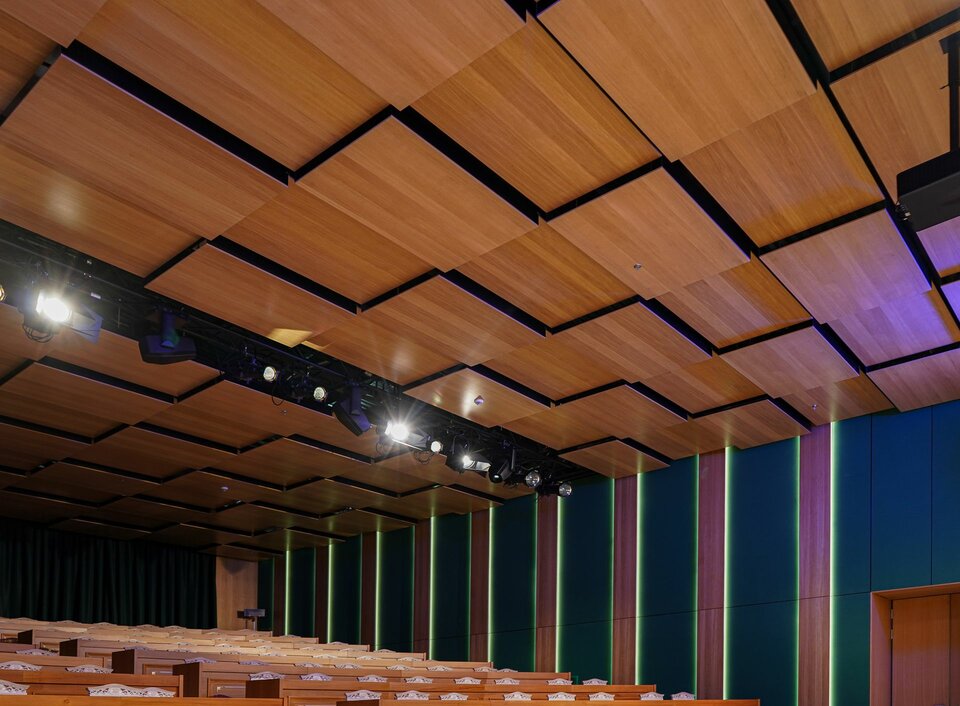 Following the successful development of the new headquarters, the team from Lindner Albania played a key role in the interior outfitting of the new CFO conference room. They supplied and installed wall cladding with real wood veneer as well as Lindner Free Metal wall cladding with a textile surface to optimise acoustics. Additionally, Lindner COMPwood acoustic partitions and the Lindner COMPwood acoustic ceiling system, also featuring perforated real wood veneer, were implemented.