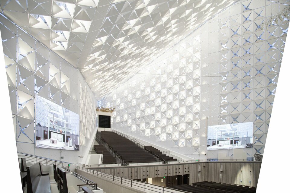 Christ Cathedral arose from the Crystal Cathedral, which was in need of renovation mostly due to the interior environment. While there were no major changes to the exterior, the interior of the church was significantly upgraded and redesigned with special wall and ceiling coverings. Triangular LMD-S metal panels are arranged in a complex pattern to create the look of quatrefoil ornaments. They conceal the entire surface of the glass facade from the inside, adressing acoustics, lighting, regulation of solar radiation, ventilation as well as visual comfort.