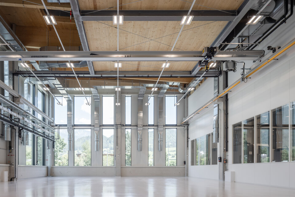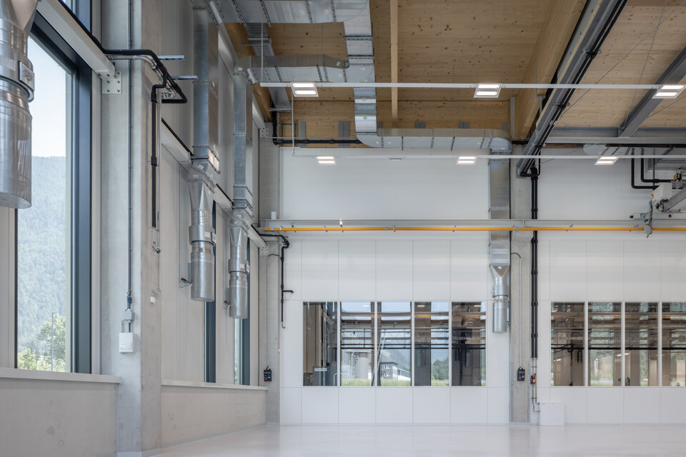 Special attention was paid to resource-efficient construction. By recovering heat from production processes and using geothermal energy, the facility operates entirely without fossil fuels. Photovoltaic systems on the roof and parking areas supply the production with independent, self-generated electricity. Greened outdoor areas, reduced surface sealing, and the integration of wooden ceilings contribute to sustainable practices and harmonise with the Alpine surroundings.
