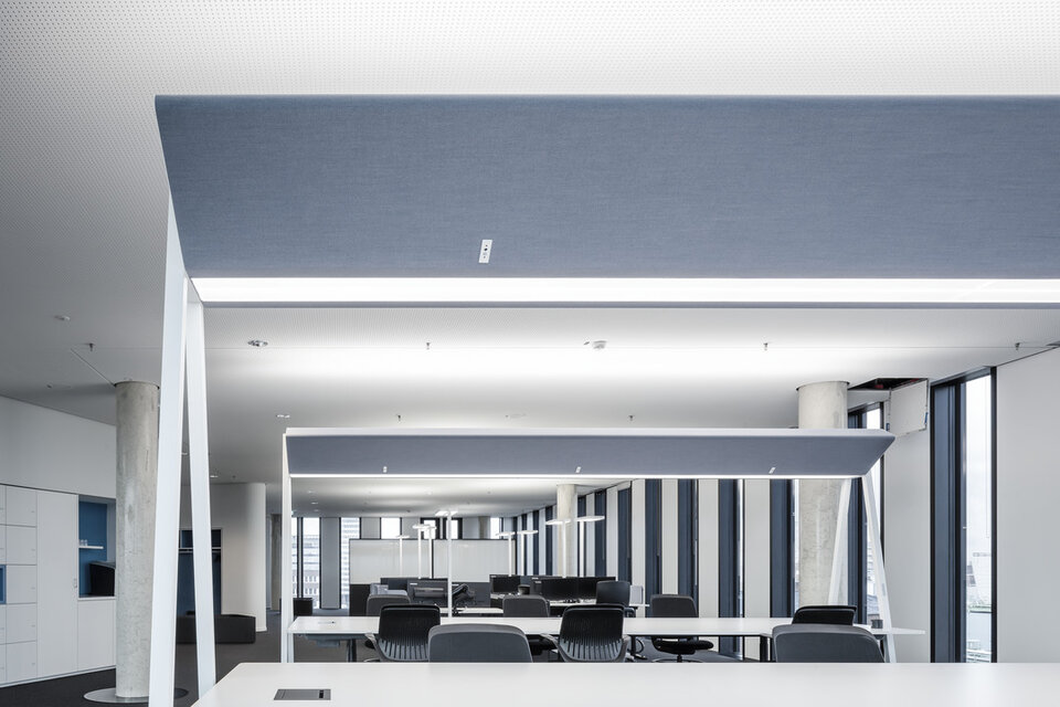 The design specification was an acoustically activated fabric covering in the form of a bridge luminaire that extends over three double workstations. Lateral steel tube supports with a width of 1,000 mm at the floor and a height of 2,345 mm serve as suspension and were equipped with levelling feet. The luminaire body is trapezoidal with the dimensions: Length 4,850mm, width 960 mm, height 345 mm. In accordance with the different colour designs of the individual tiers, there are five different coloured, laminated textile coverings type Kvadrat Rime. The tubular steel frame was powder-coated in RAL 9016. To reduce weight, the basic body was provided with a perforated pattern, yet the total weight still amounts to 125 kg per luminaire.