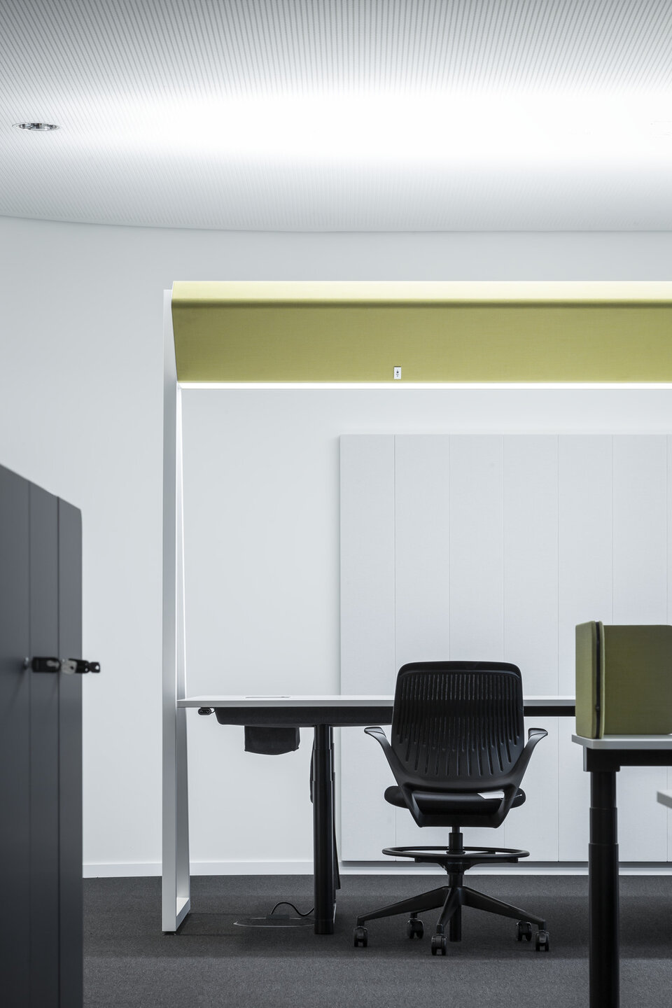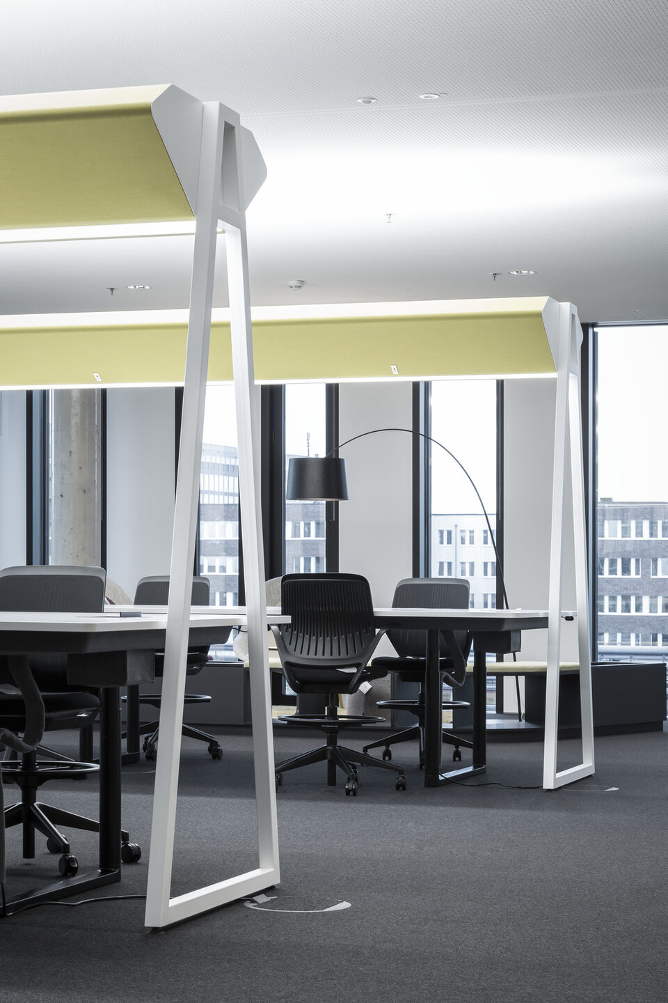 The light control (daylight, presence) takes place by means of wireless motion sensors integrated in the textile field. Of course, this can also be operated manually by means of light control at the respective individual workstation. In addition, it is possible to integrate the free-standing luminaires, which are also supplied by Signify, into a zone and group control system. The connection cables have a mains socket on the upright side and a Schuko plug on the other end.