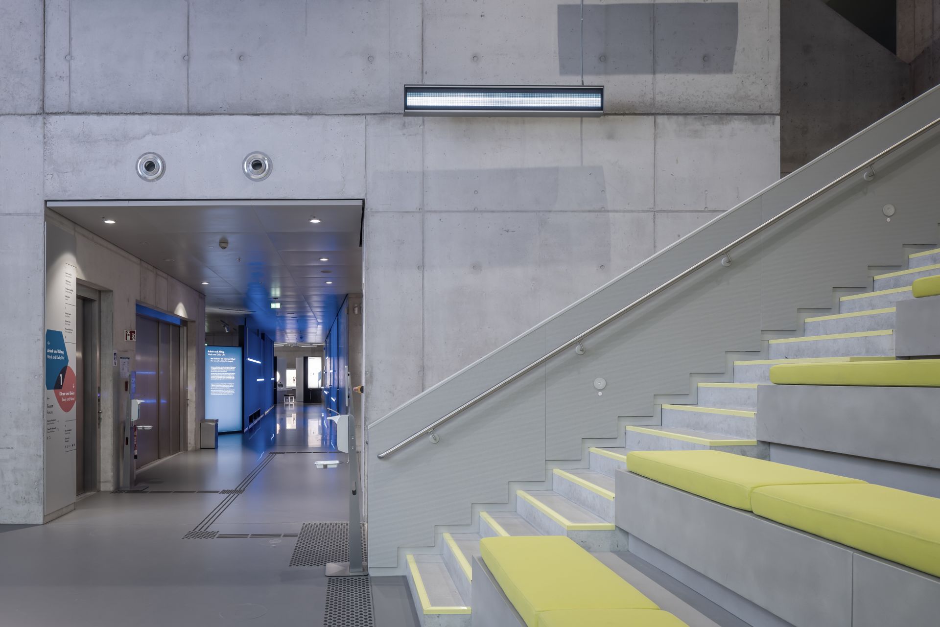 For a coherent overall impression, the finishing products naturally also had to meet some requirements - future products with regard to function, architecture and sustainability were required. With the silver award-winning Cradle to Cradle Certified® access floor FLOOR and more®, Lindner has installed an exceptionally sustainable product. The staircase was constructed with FLOOR and more® arena and covered with LinCrete glass fibre concrete, thus visually matching the existing exposed concrete. The project-specific solution of Plafotherm® heated/cooling ceilings, whose large-format ceiling elements are also architecturally coordinated, additionally ensures suitable acoustics and air conditioning in the museum. To complete the picture and ensure an optimum climate control and acoustics, acoustic wall cladding was also installed.