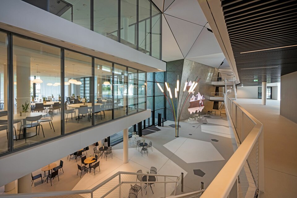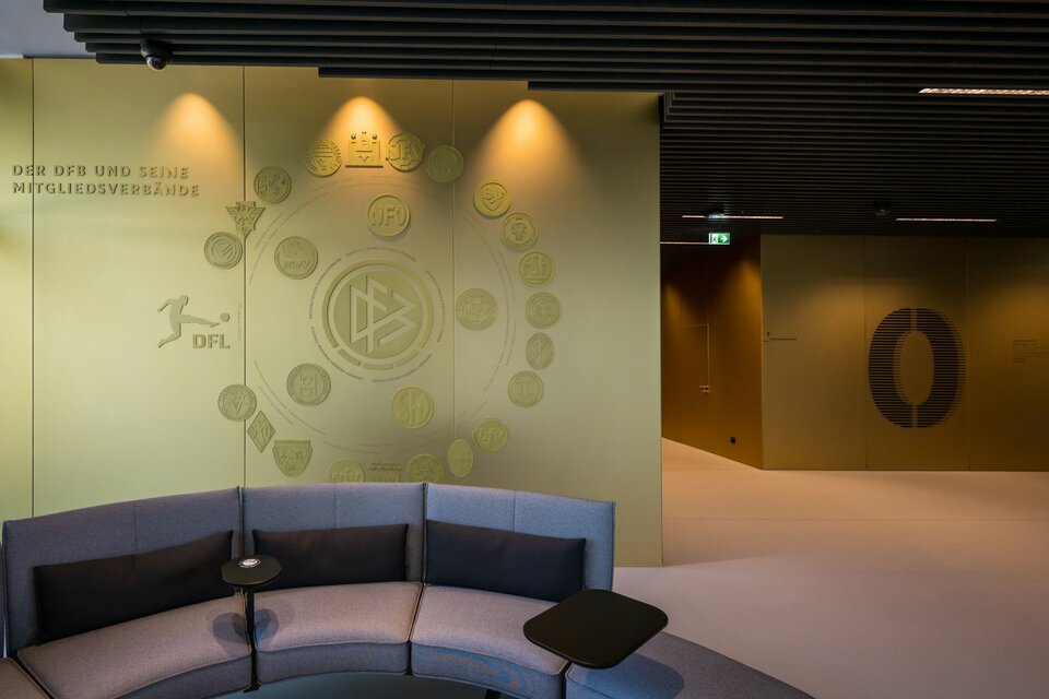 As part of the project, Lindner created a unique wall cladding made of pentagonal panels for the building's foyer: The silver-coloured elements in a honeycomb structure were complemented by two LED screens recalling the great moments of German football. Other gold-coloured and foiled metal wall panels provide an overview of the DFB and its member associations. An open, modern atmosphere and spatial separation are also created by the glass partitions installed in the campus in the conference and dining hall as well as in the administration and office areas. The building is complemented by grey metal wall cladding in the corridors around the lifts on the Boulevard.