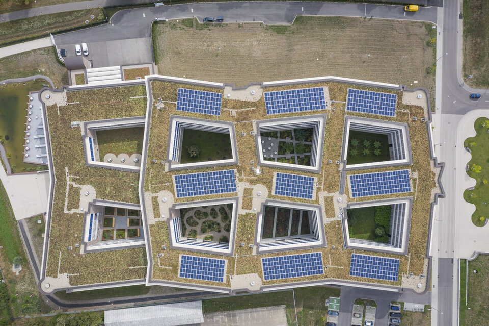 "Here I am human, here I dare to be" – the sentence from Goethes Faust can be found throughout the corporate culture of the drugstore retailer dm. This also applies to the architectural design of the new dm headquarters, the "dialogicum" which is based in the Karlsruhe district Durlach. On 41,000 m², a honeycomb-shaped building with a maximum of four floors was created, which with its green inner courtyards offers plenty of space, open space and light for up to 1,800 employees. A wide corridor runs through the entire building and ends in a staff restaurant and an event hall for about 260 people. A further building serves as alternative area and parking garage. Its steeply tapering roof with intensive greenery visually and acoustically separates it from the nearby motorway.
