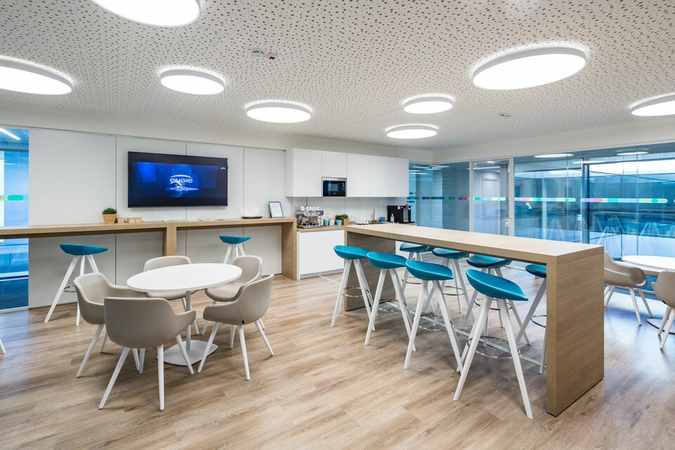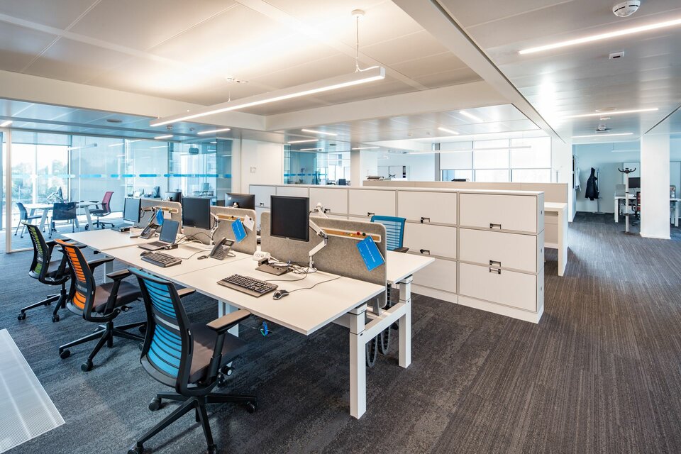 Lindner implemented about 4,350 m² of the linear heated and chilled post cap ceiling system Plafotherm® B 100, including ventilation shrouds. The ceiling system has a linear appearance and a low construction height. Moreover, Lindner implemented about 500 m² of Plafotherm® GK Hekda made from plasterboard, likewise as a heated and chilled ceiling system.