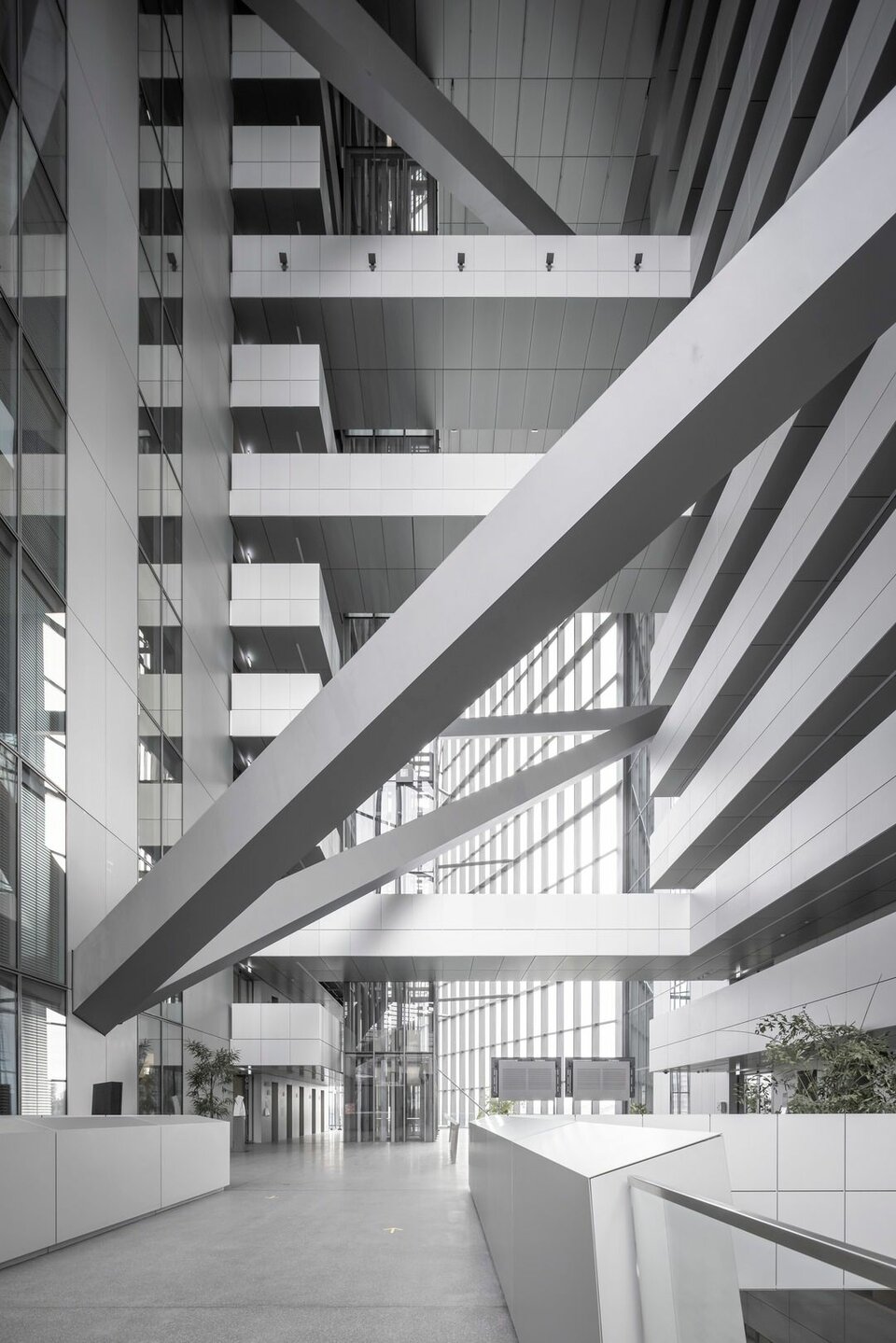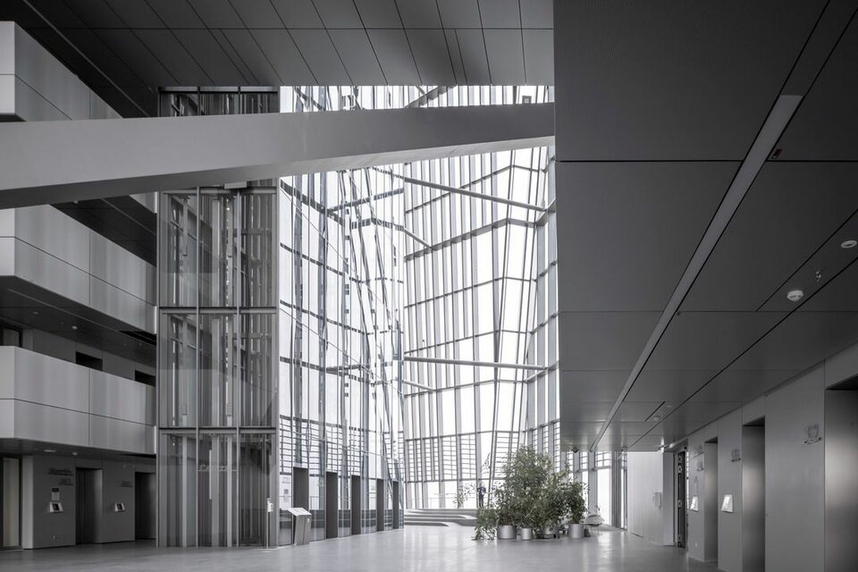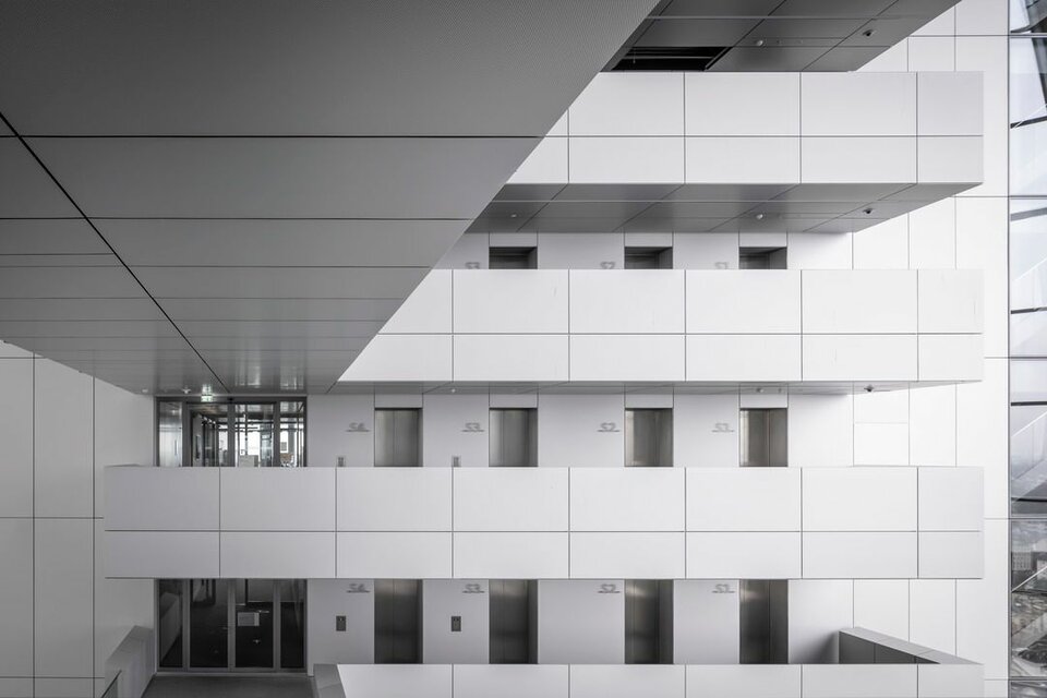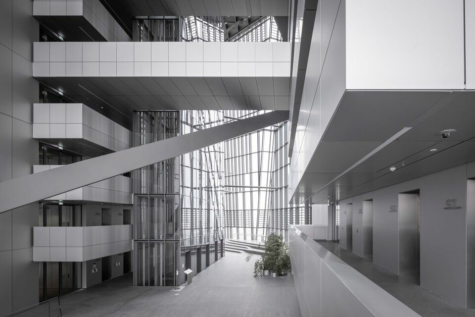 This ensemble consists of three elements, one of them being a former market hall that was build in the 1920´s. The other two elements are polygonal towers that were built in for this project. With a height of 185 metres, the north tower surpasses its twin in the south by 20 metres. Both of these structures have a combined gross floor area of 110,000 sqm. The three elements are connected with a common entrance structure. In total, this new headquarters of the ECB offers enough space to house the workplaces of 2,300 employees.