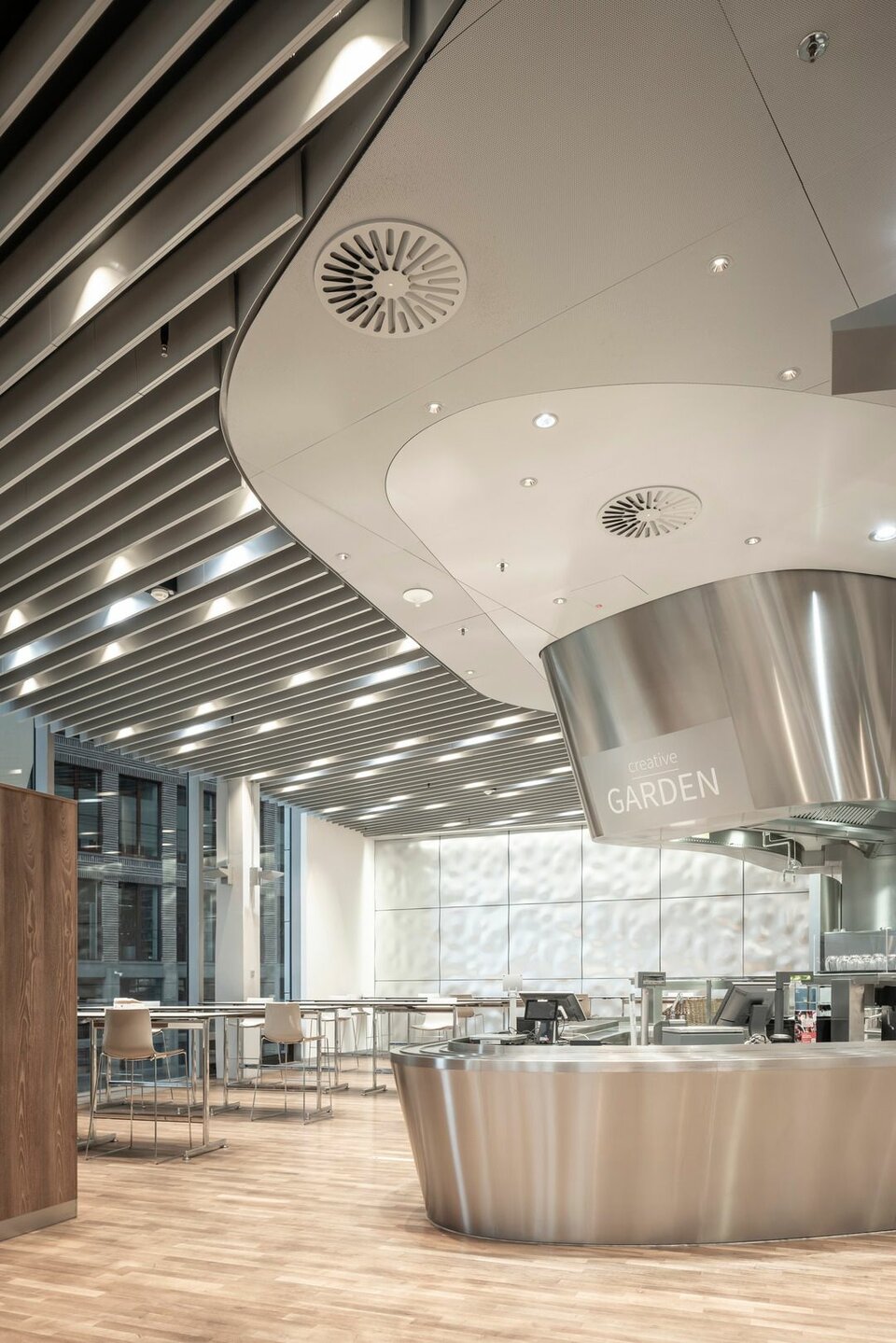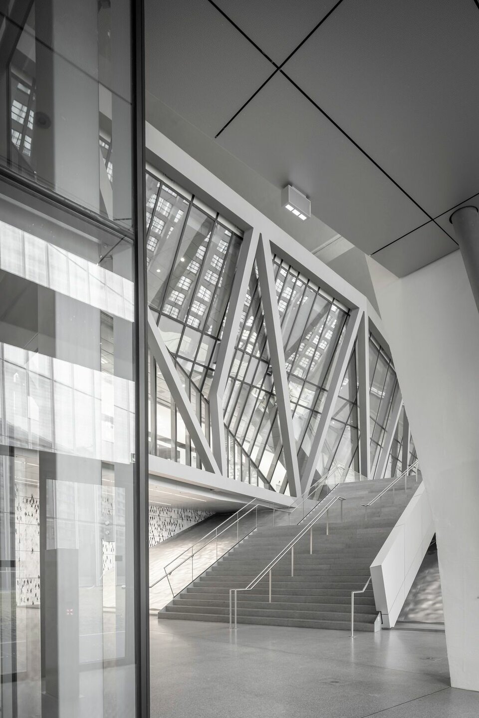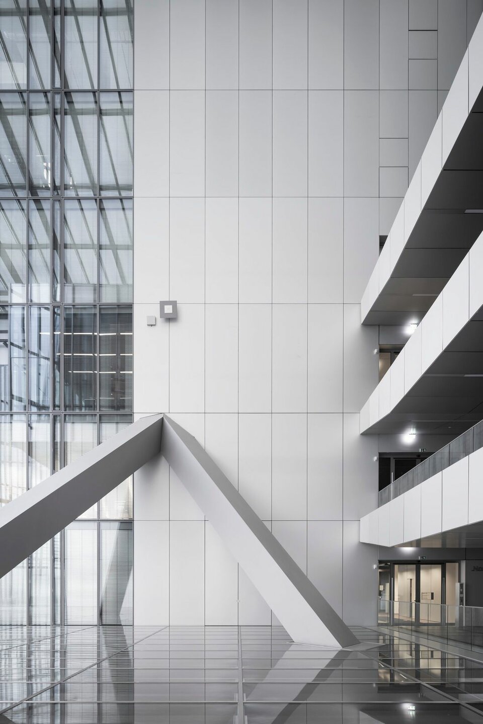 This ensemble consists of three elements, one of them being a former market hall that was build in the 1920´s. The other two elements are polygonal towers that were built in for this project. With a height of 185 metres, the north tower surpasses its twin in the south by 20 metres. Both of these structures have a combined gross floor area of 110,000 sqm. The three elements are connected with a common entrance structure. In total, this new headquarters of the ECB offers enough space to house the workplaces of 2,300 employees.